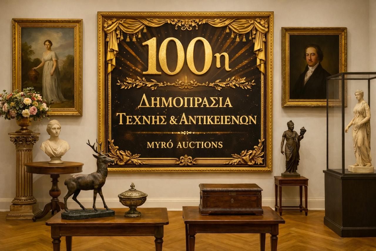 Καλώς ορίσατε στην 100η Τακτική Δημοπρασία Τέχνης και Αντικών του Myro Antiques House. Η εκδήλωση θα πραγματοποιηθεί την Κυριακή 19 Απριλίου 2026, στις εγκαταστάσεις μας στη Σουρωτή Θεσσαλονίκης, στο γνώριμο περιβάλλον που φιλοξενεί σταθερά τις δραστηριότητές μας.
