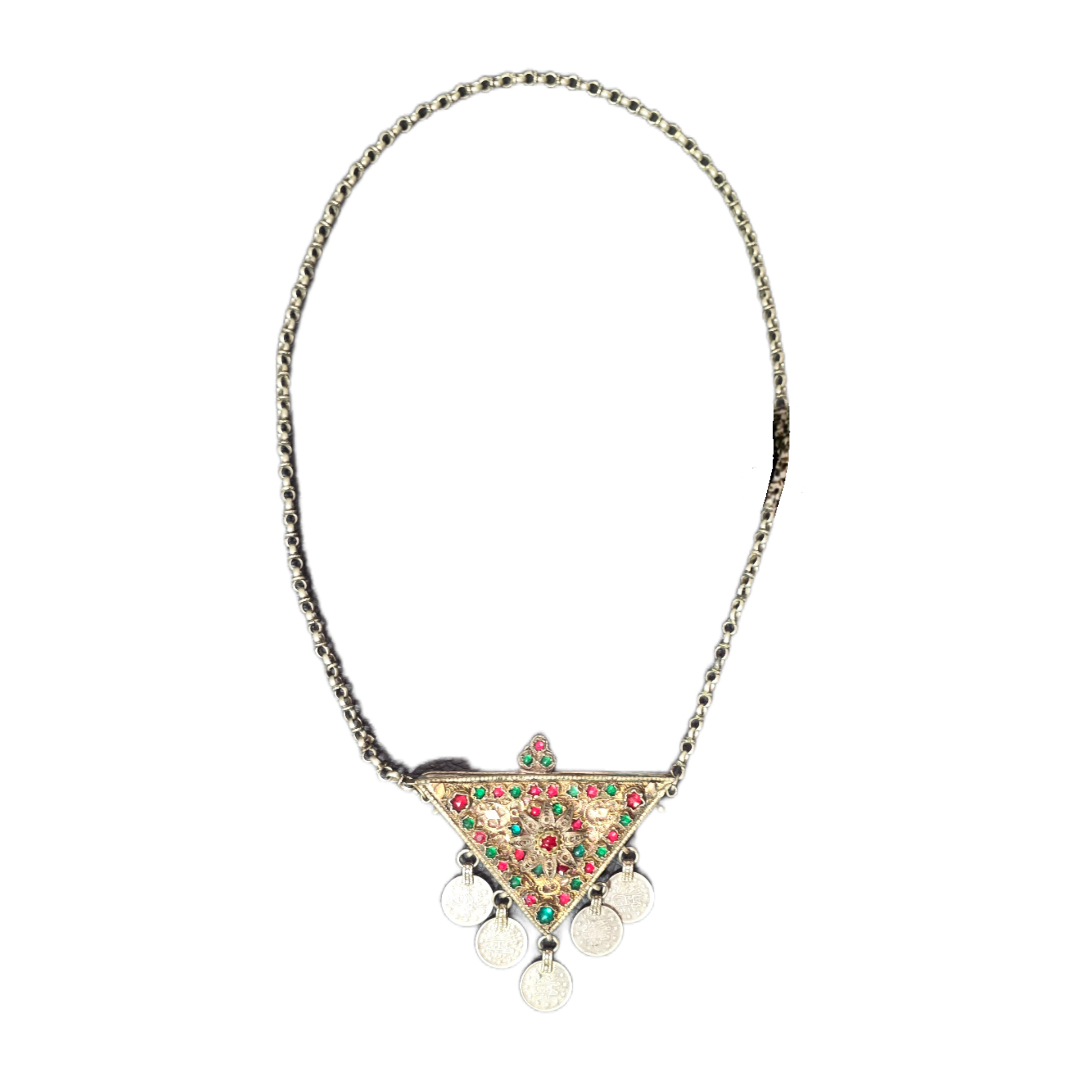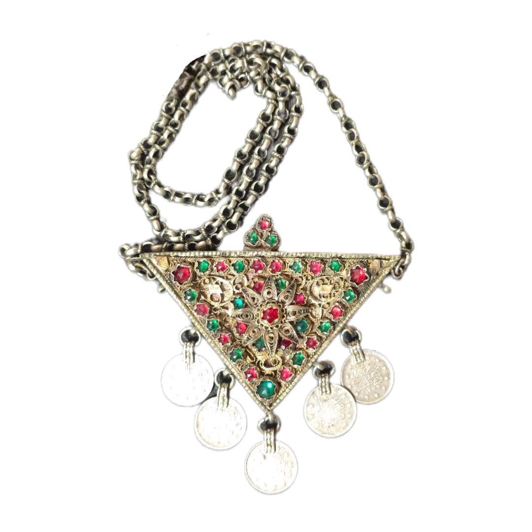 Triangular amulet with chain and stones.