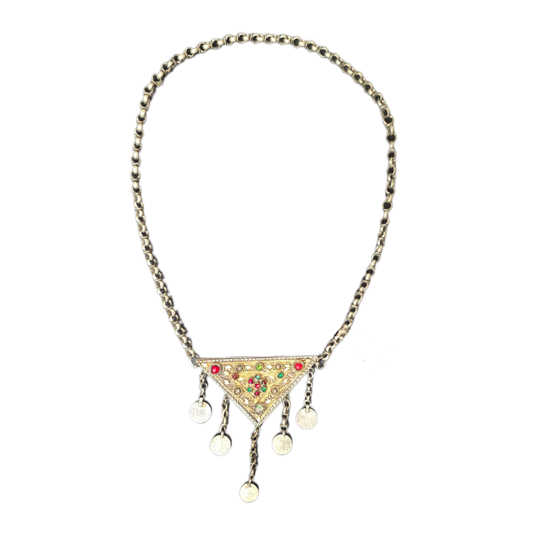 Triangular amulet with chain.