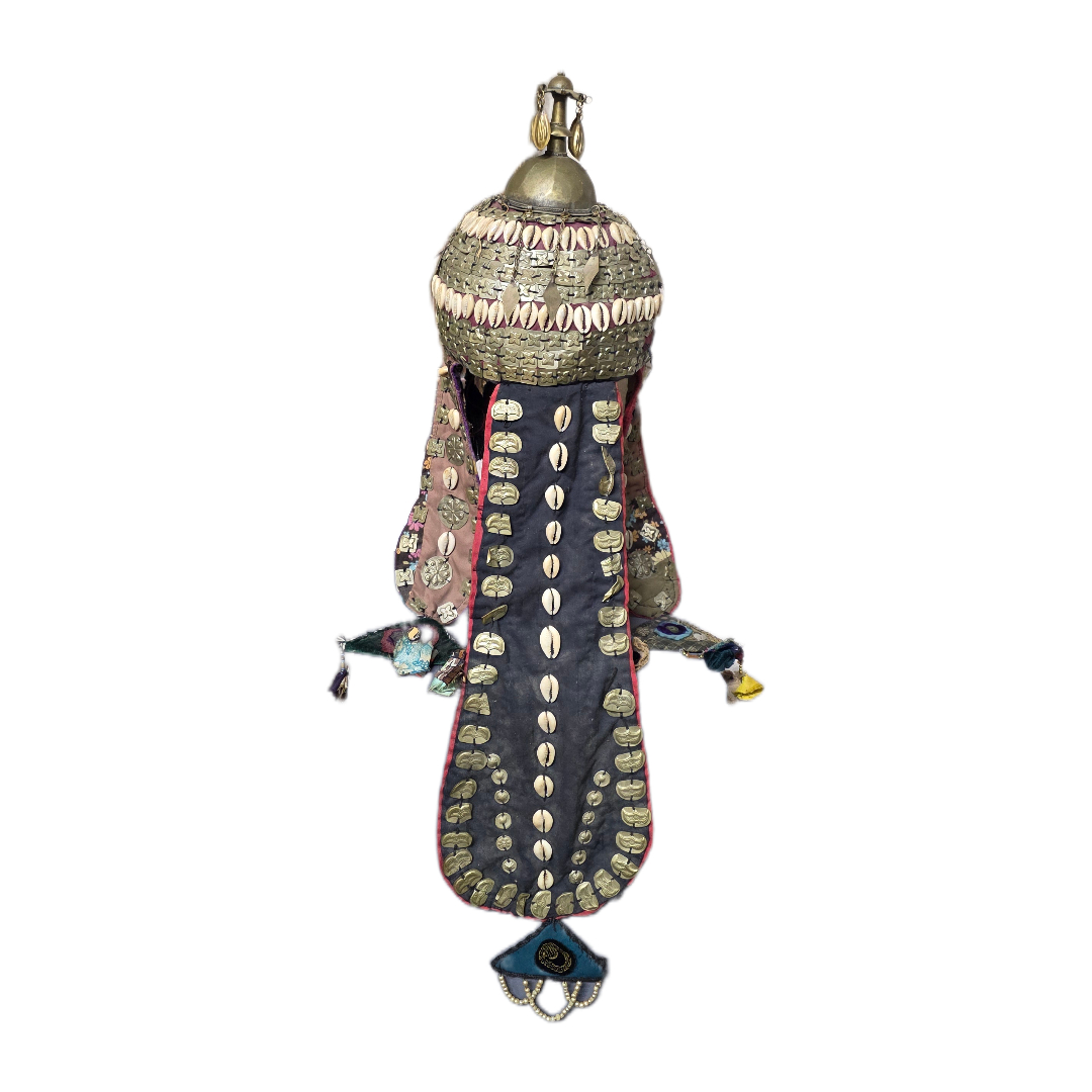 An elaborate costume helmet richly adorned with metal elements, cowrie shells, textiles, and colorful beads.