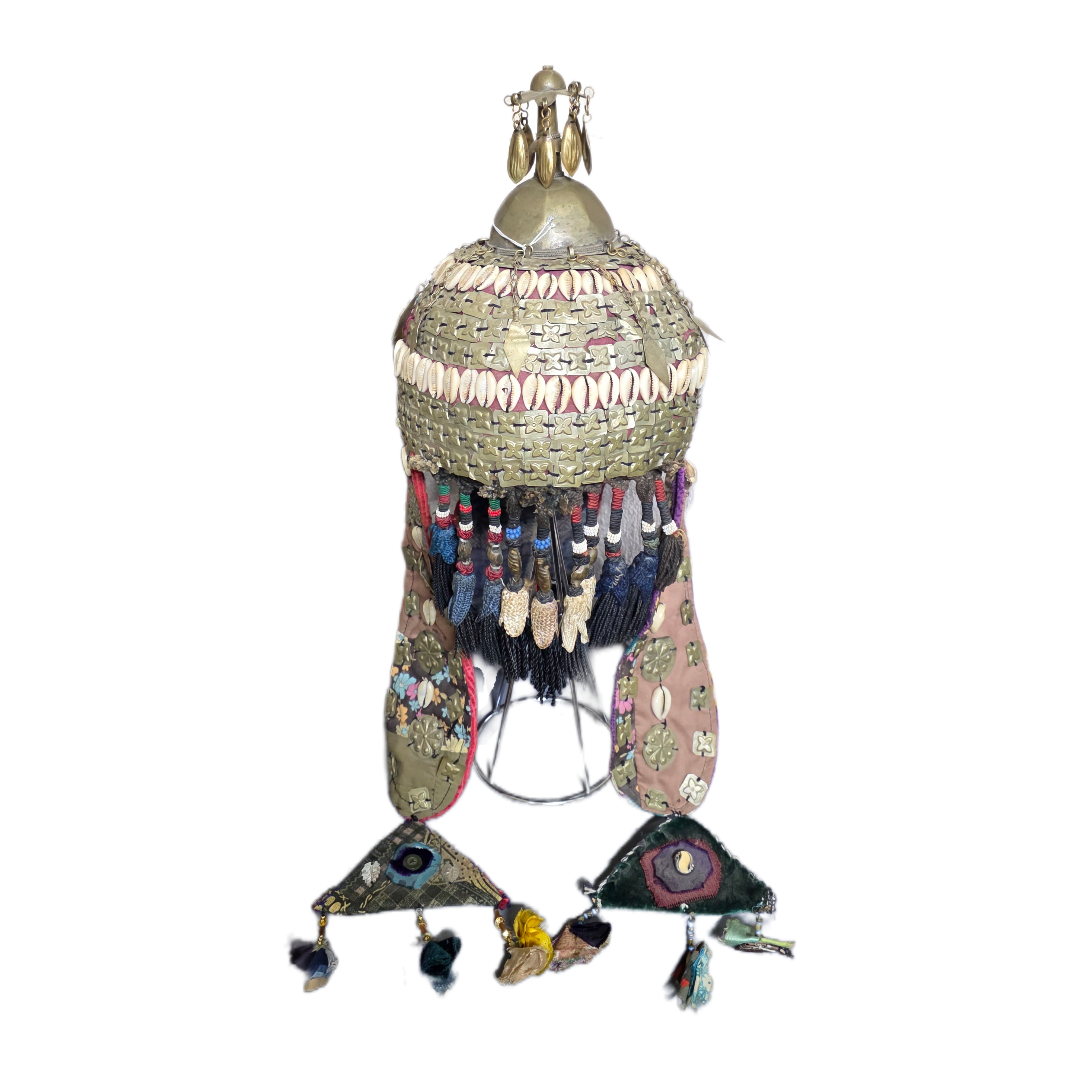 Εντυπωσιακό κράνος στολής, πλούσια διακοσμημένο με μεταλλικά στοιχεία, κοχύλια (cowrie shells), υφασμάτινα μέρη και πολύχρωμες χάντρες.