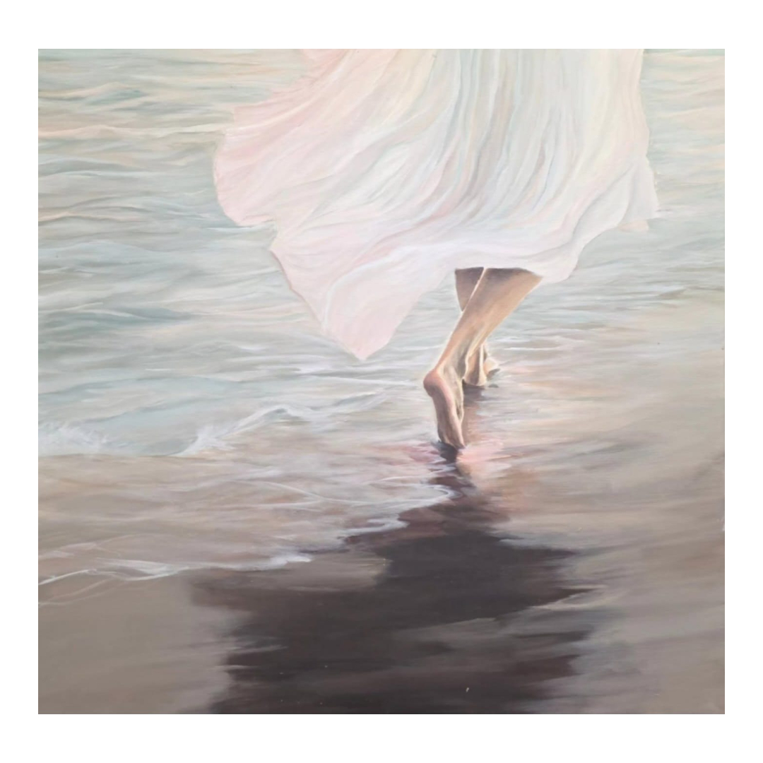 The composition conveys calmness and introspection, with a subtle surface treatment that creates an atmospheric and poetic effect.