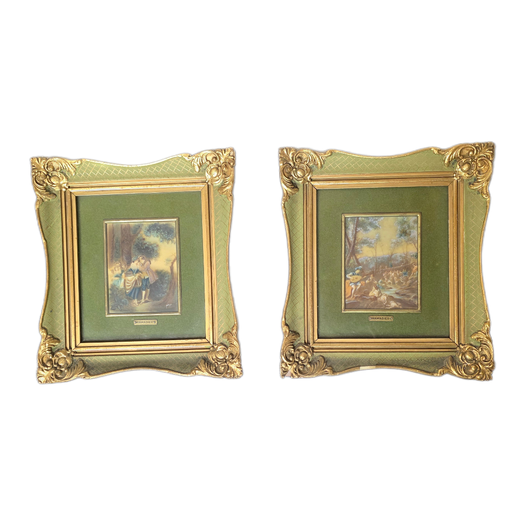 Pair of small decorative paintings with rococo-style gilt frames featuring ornate details.