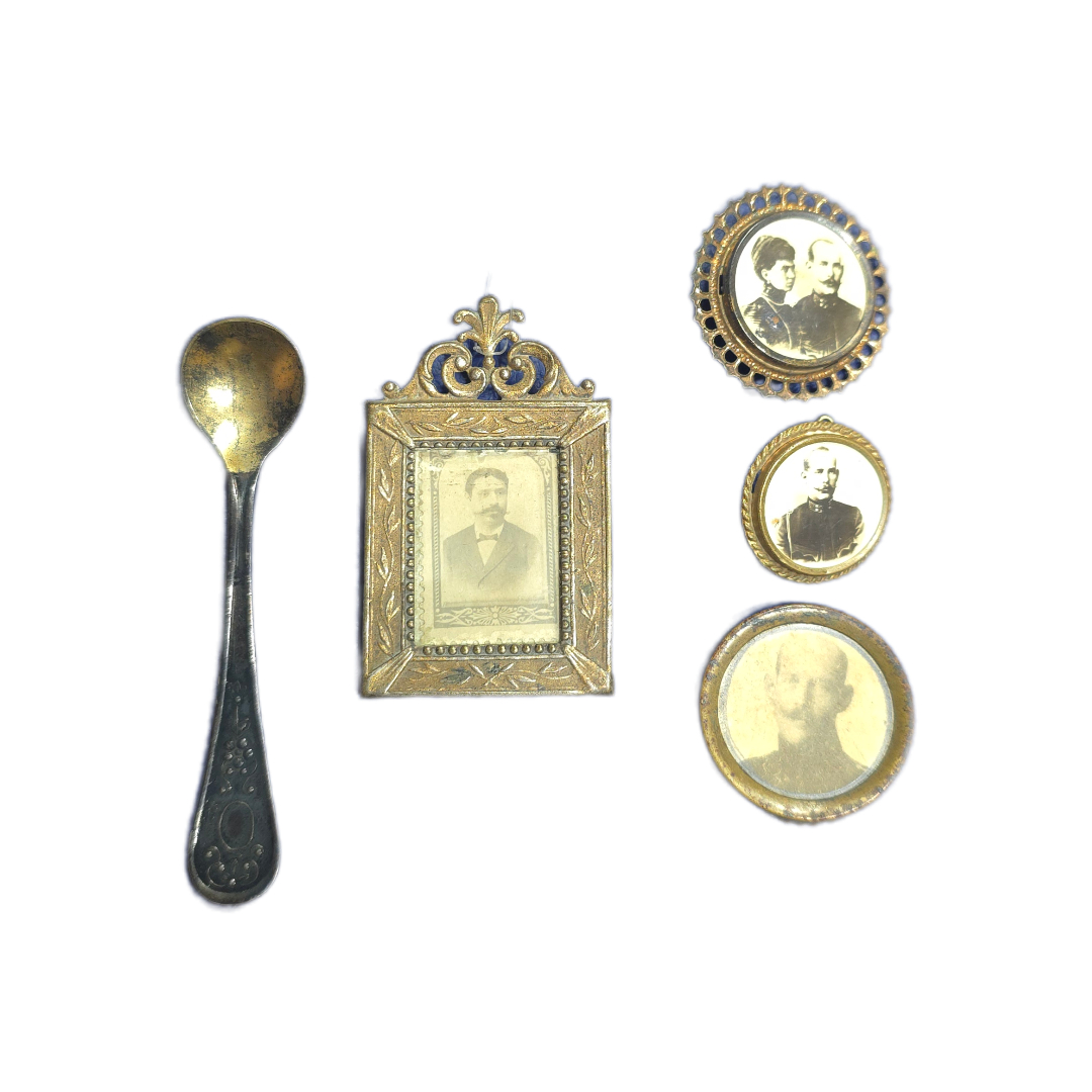 Ενδιαφέρον μικρό σύνολο που αποτελείται από τέσσερα καρφιτσάκια με ενσωματωμένες παλαιές φωτογραφίες (πιθανόν οικογενειακά πορτρέτα) και ένα μικρό κουταλάκι. Τα καρφιτσάκια φέρουν μεταλλικά πλαίσια με διακοσμητικά στοιχεία, ορισμένα με επιχρυσωμένες λεπτομέρειες και σμάλτο, αποπνέοντας αισθητική τέλους 19ου – αρχών 20ού αιώνα.