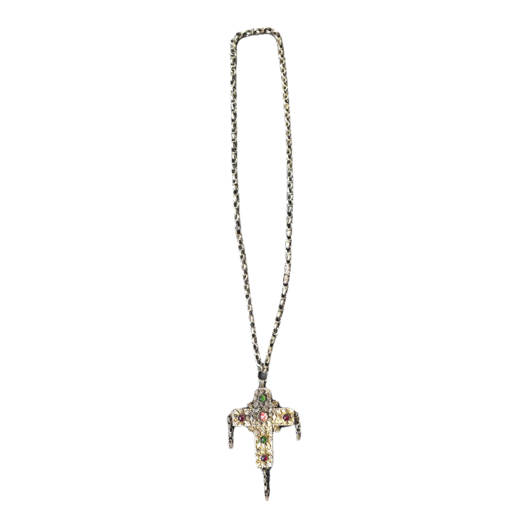 Silver cross with stones.