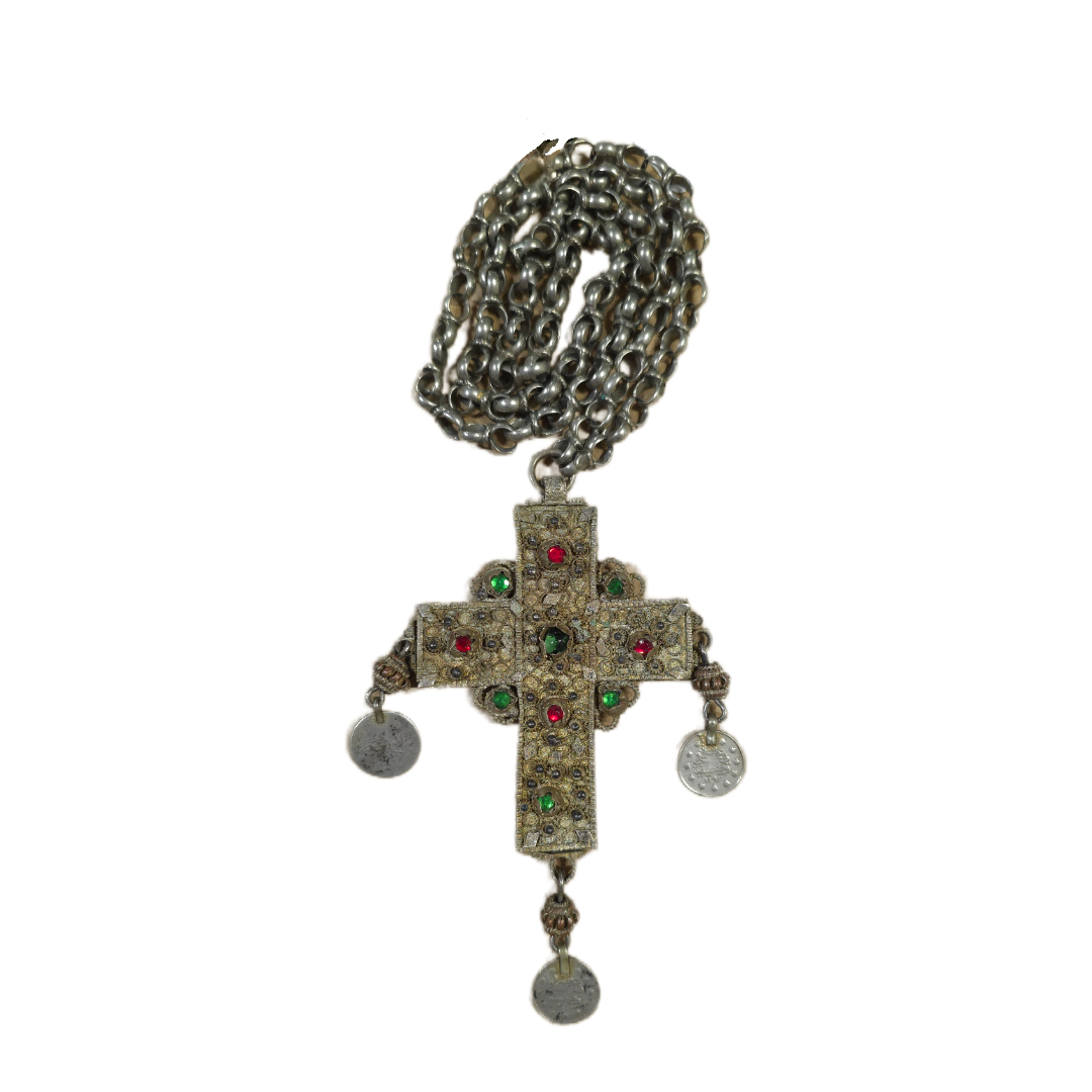 Cross with green and red stones and chain.