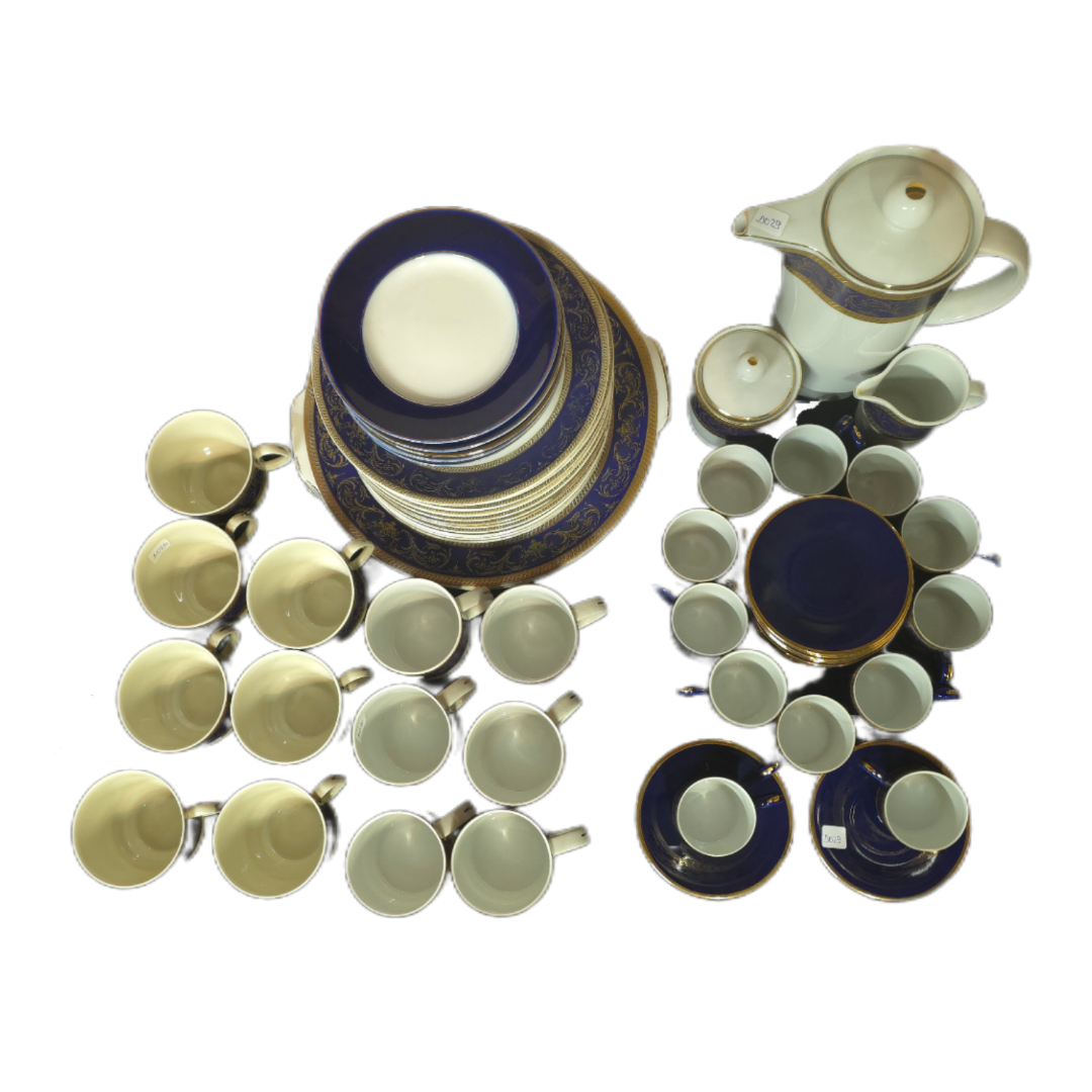 Impressive complete porcelain tea set consisting of 59 pieces, decorated in an elegant blue and gold pattern. Includes cups, saucers, serving plates, teapot/coffee pot, sugar bowl, and milk jug, forming a fully functional serving ensemble.