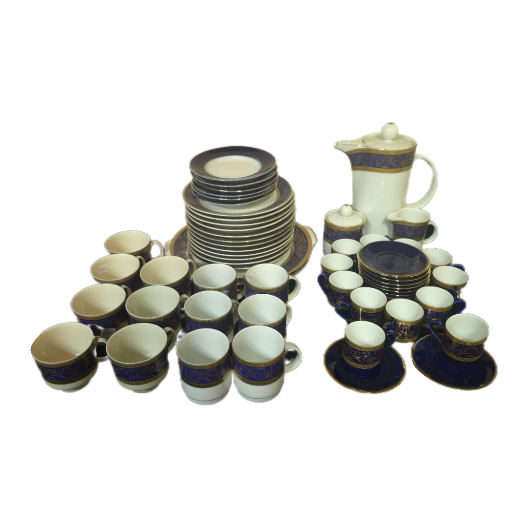 Εντυπωσιακό πλήρες σετ τσαγιού από πορσελάνη, αποτελούμενο από 59 τεμάχια, σε κομψό συνδυασμό μπλε και χρυσού διακόσμου. Περιλαμβάνει φλυτζάνια, πιατάκια, πιάτα σερβιρίσματος, τσαγιέρα/καφετιέρα, ζαχαριέρα και γαλατιέρα, προσφέροντας ολοκληρωμένη σύνθεση για σερβίρισμα.
