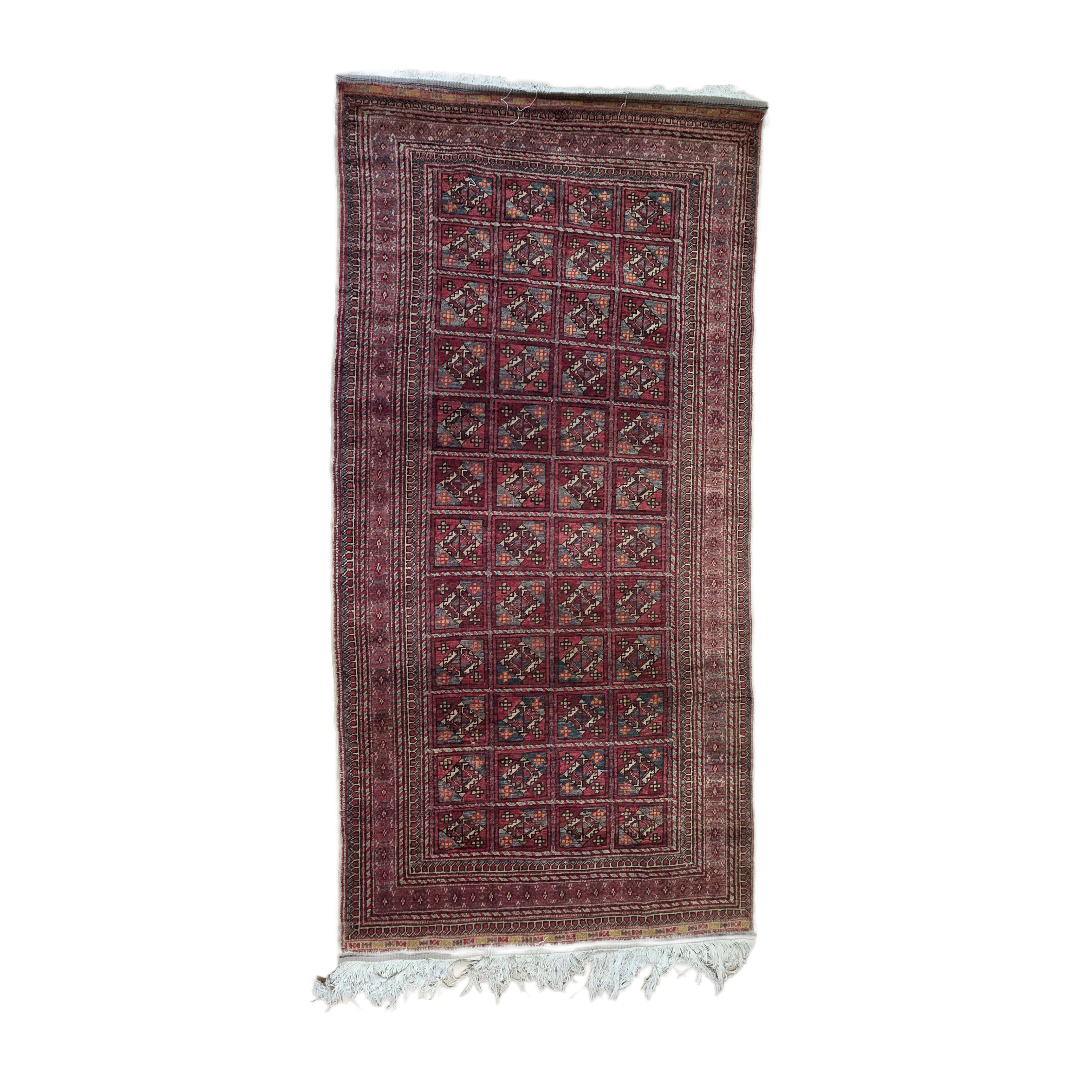 Ανατολίτικο χαλί με επαναλαμβανόμενο γεωμετρικό μοτίβο σε μορφή πλέγματος, σε βαθύ κόκκινο κάμπο με μπλε και γήινες αποχρώσεις.