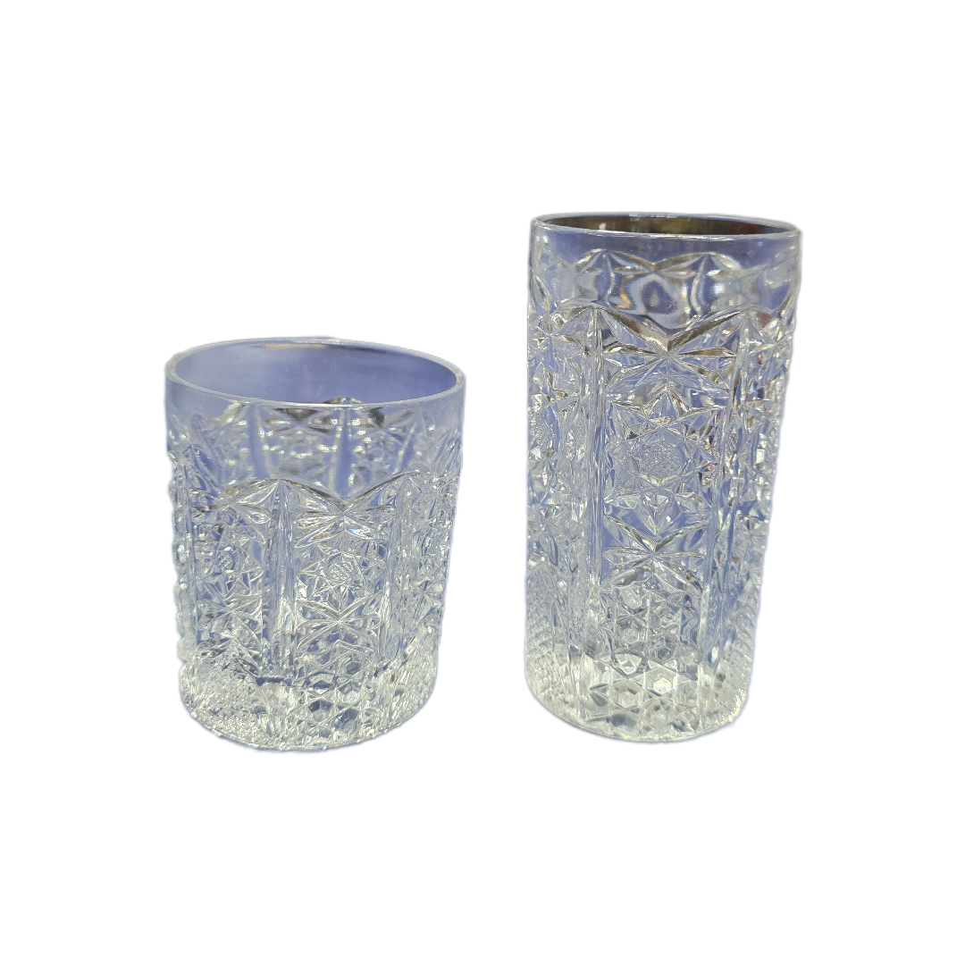 Impressive set of two dozen cut crystal glasses featuring rich geometric patterns that beautifully reflect light.