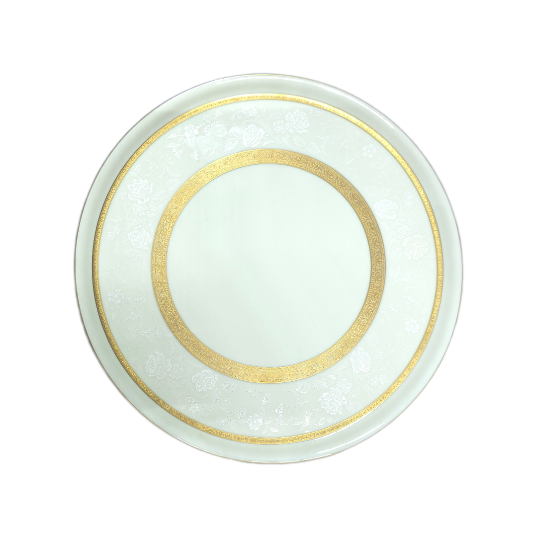 Το πιάτο Mikasa (διάμετρος 29 εκ.) ανήκει στη σειρά Antique Lace, με διακριτικό ανάγλυφο διάκοσμο και επιχρυσωμένο στεφάνι, κατασκευασμένο στην Ιαπωνία.