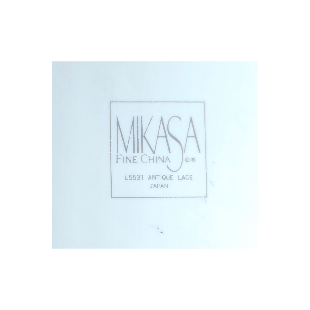 The Mikasa plate (29 cm diameter) belongs to the Antique Lace series, with subtle embossed decoration and a gold rim, made in Japan.