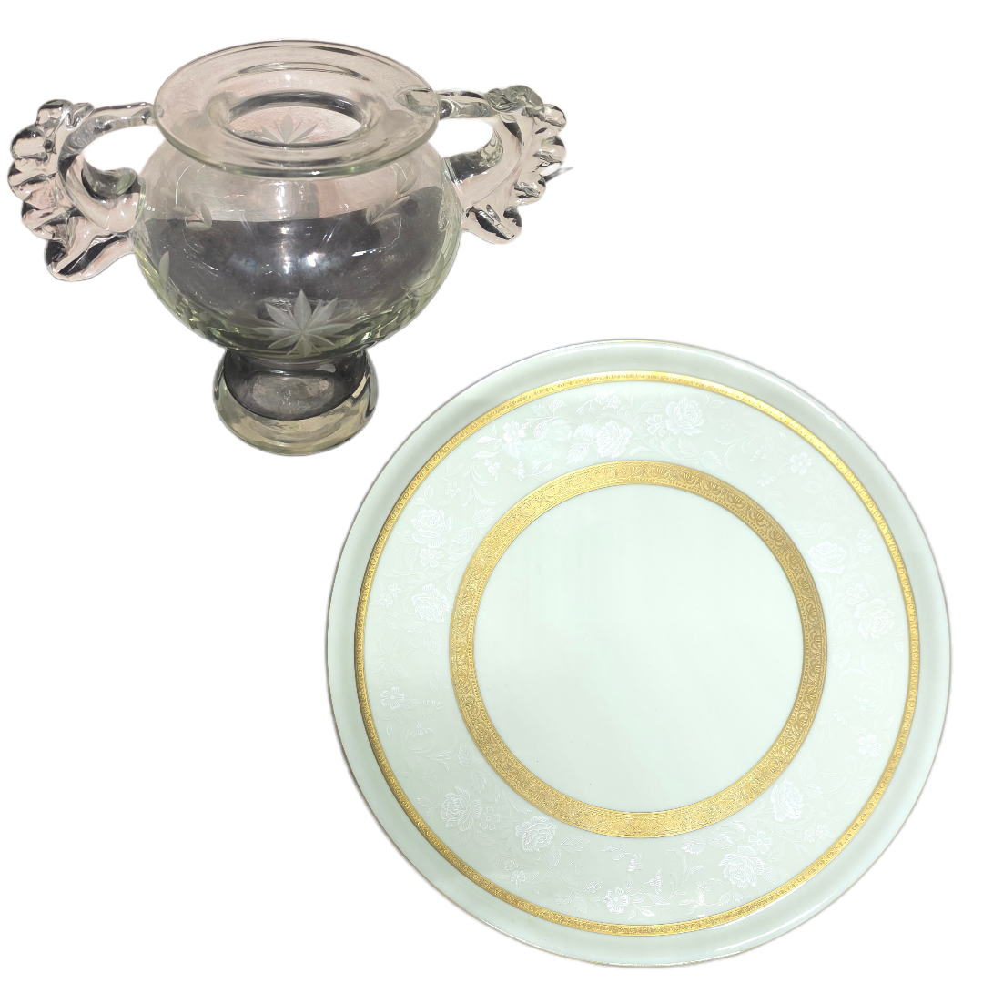 Ιδιαίτερο σύνολο που αποτελείται από ένα διακοσμητικό γυάλινο βάζο και ένα πιάτο πορσελάνης Mikasa.