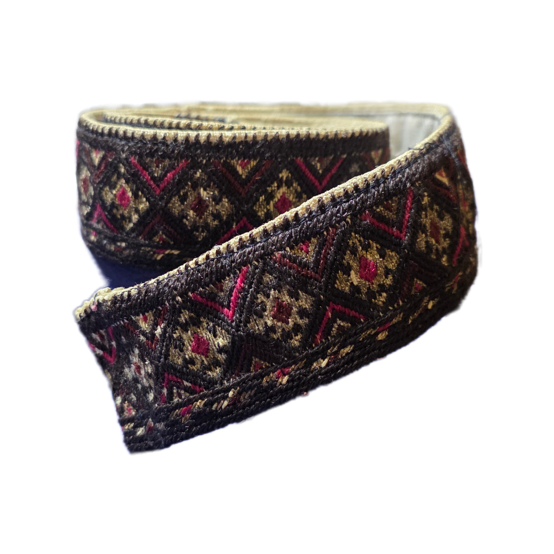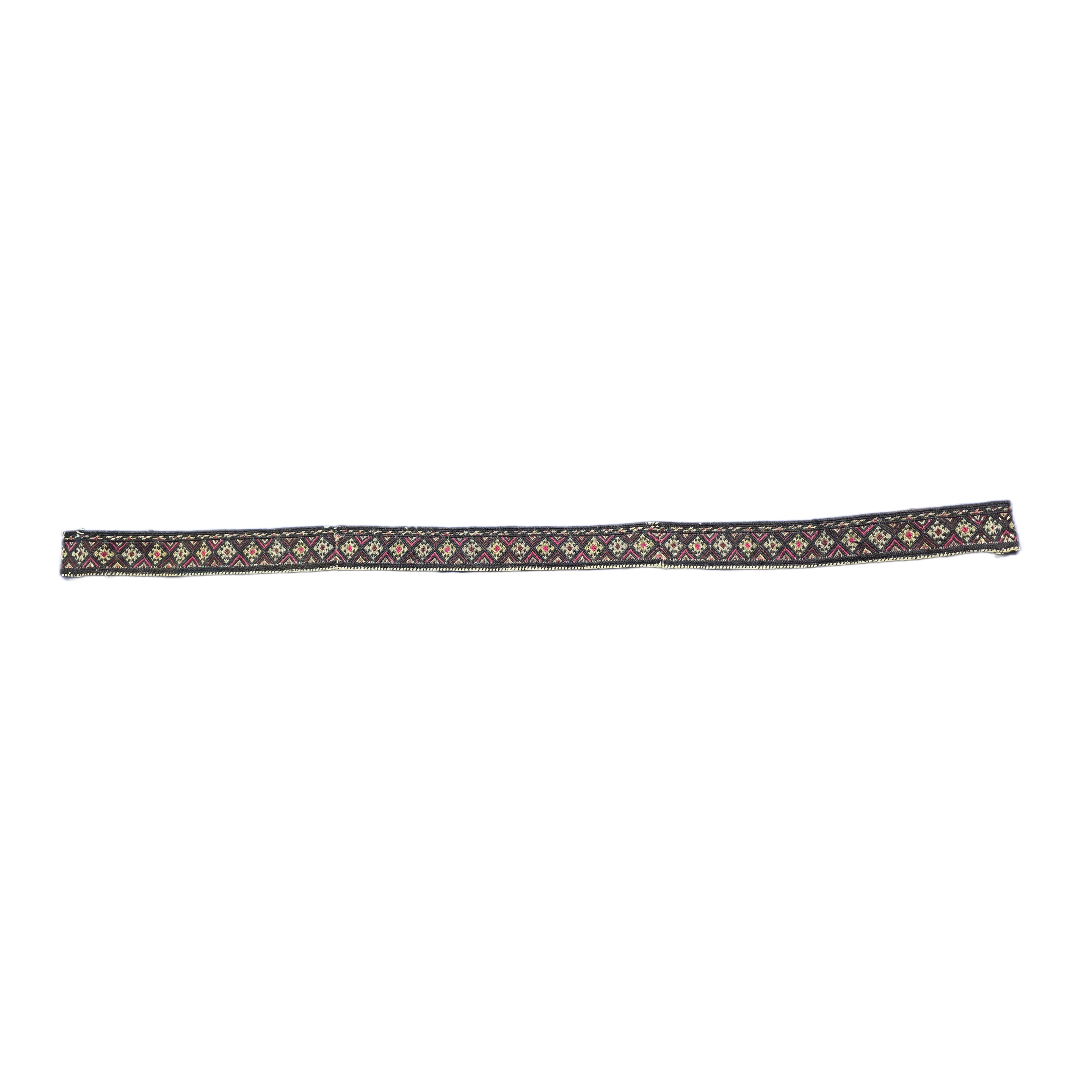 Διακοσμητική παραδοσιακή ζώνη μικρότερου μήκους, κατασκευασμένη από υφαντό ύφασμα με έντονα πολύχρωμα γεωμετρικά σχέδια και δερμάτινα άκρα. Το σχέδιο παραπέμπει σε λαϊκή τέχνη, πιθανόν βαλκανικής ή ανατολίτικης προέλευσης.