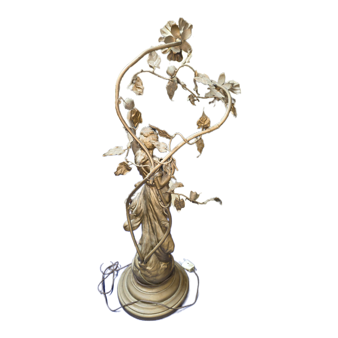 Εντυπωσιακή επιδαπέδια ή επιτραπέζια λάμπα σε μορφή γλυπτού, κατασκευασμένη από μέταλλο με επίχρυση/μπρονζέ απόχρωση, που απεικονίζει γυναικεία μορφή περιβαλλόμενη από άνθη και φυτικά μοτίβα. Η σύνθεση αποπνέει αισθητική αρ νουβό, με έντονη κίνηση και διακοσμητική λεπτομέρεια.