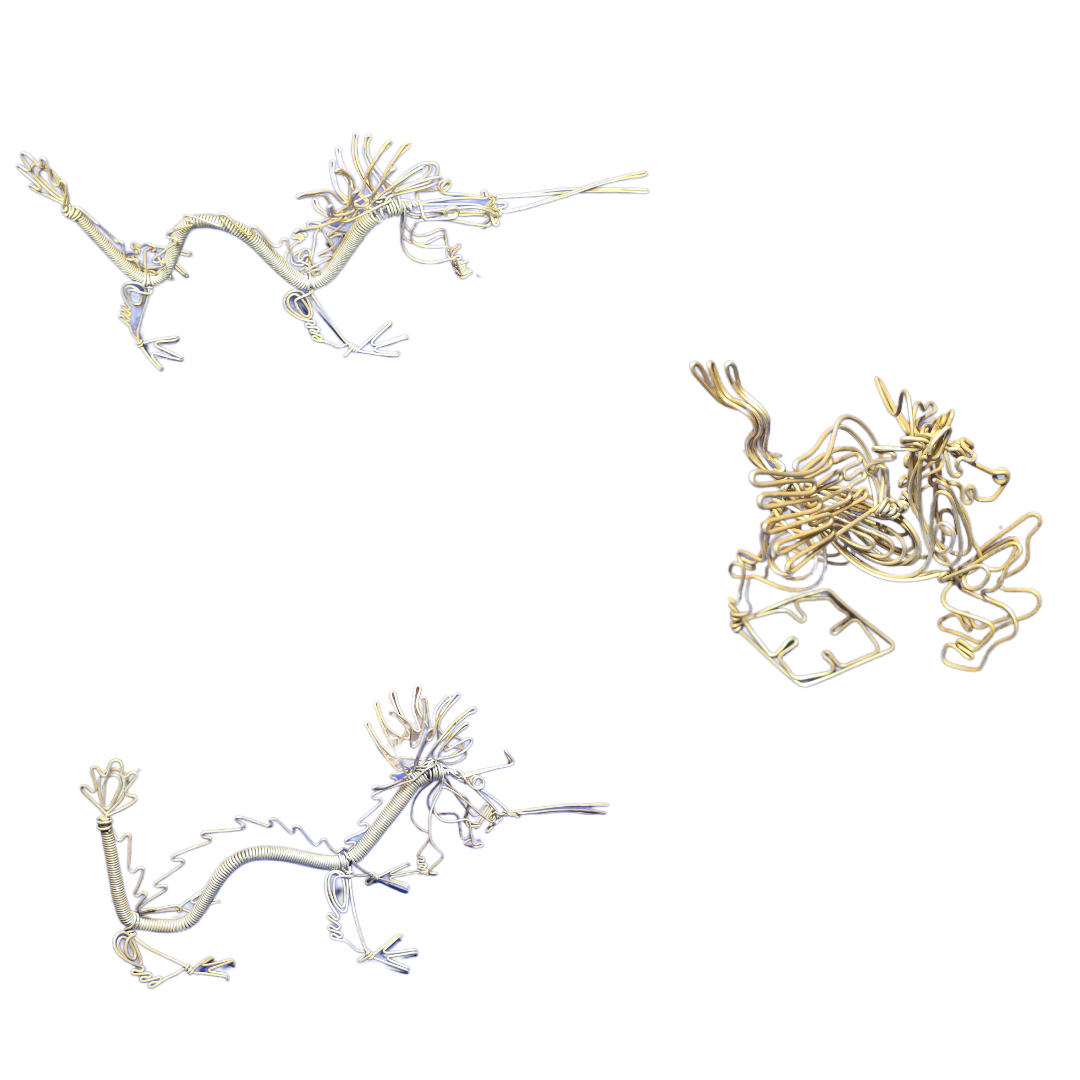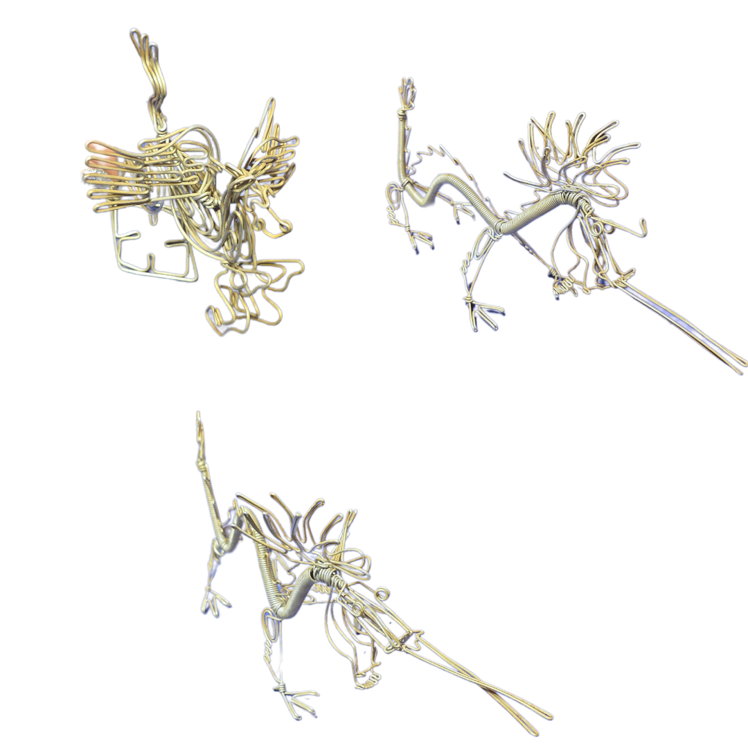 Set of wire sculptures depicting dragons, fantastical animals and musical instruments, handmade from metal wire, 20th century.