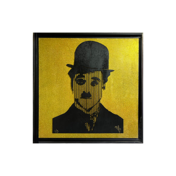 The golden background, glittering almost smugly, functions ironically: its sparkle does not reach the face. On the contrary, it deepens the sadness of the image, the disillusionment of the show. Chaplin, the most recognizable hero of cinema, becomes here a sacred silhouette, almost a statue, of a world that laughed in order not to cry.