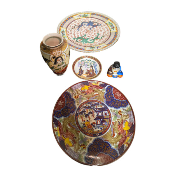 Five Asian porcelain decorative pieces.