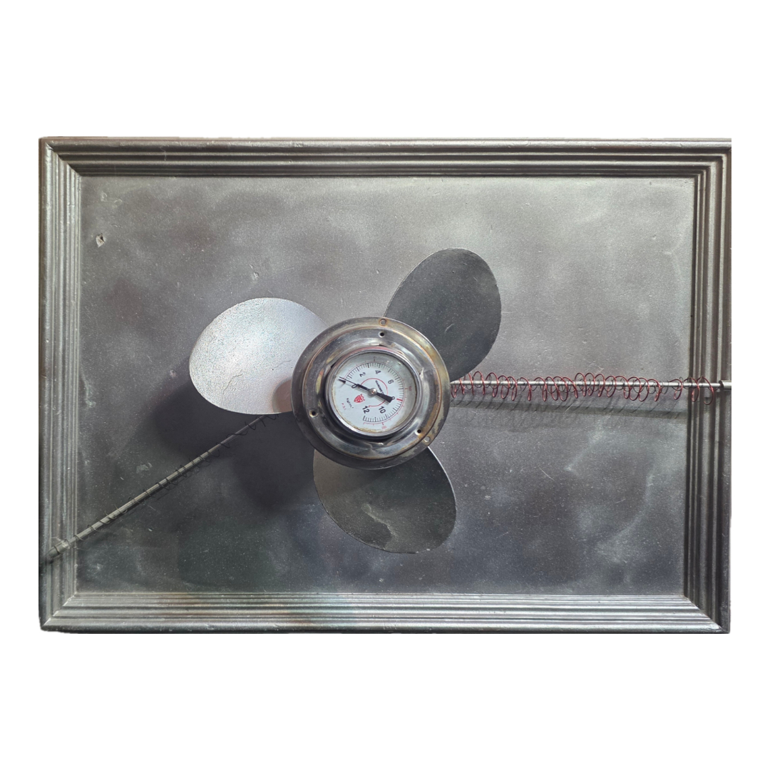 Έργο με έντονη βιομηχανική αισθητική, όπου προπέλα και παλαιός μετρητής ενσωματώνονται σε μεταλλική επιφάνεια, δημιουργώντας μια ισχυρή αίσθηση μηχανικού assemblage.