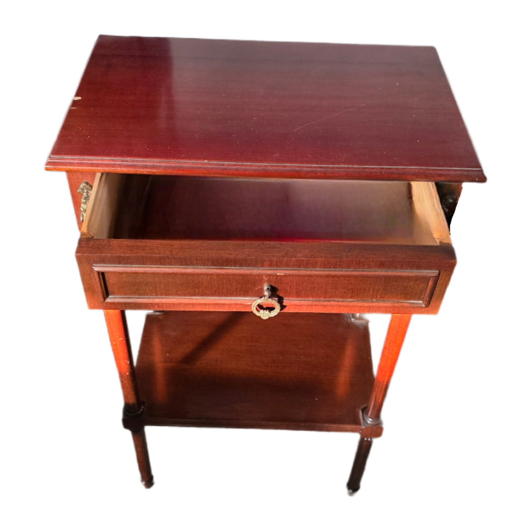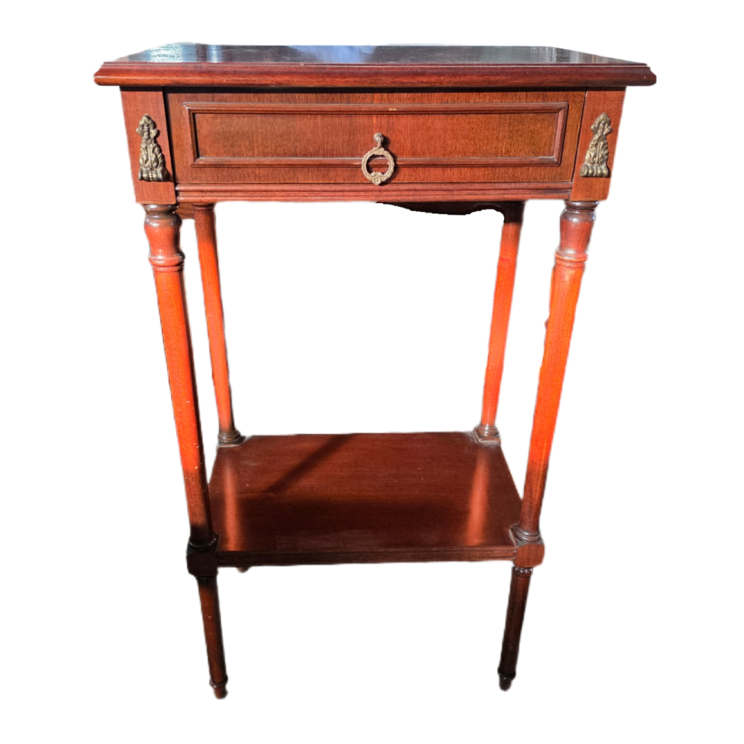Κομψό ξύλινο τραπεζάκι εποχής με ένα συρτάρι και διακοσμητικά μπρούτζινα στοιχεία στα πλαϊνά.