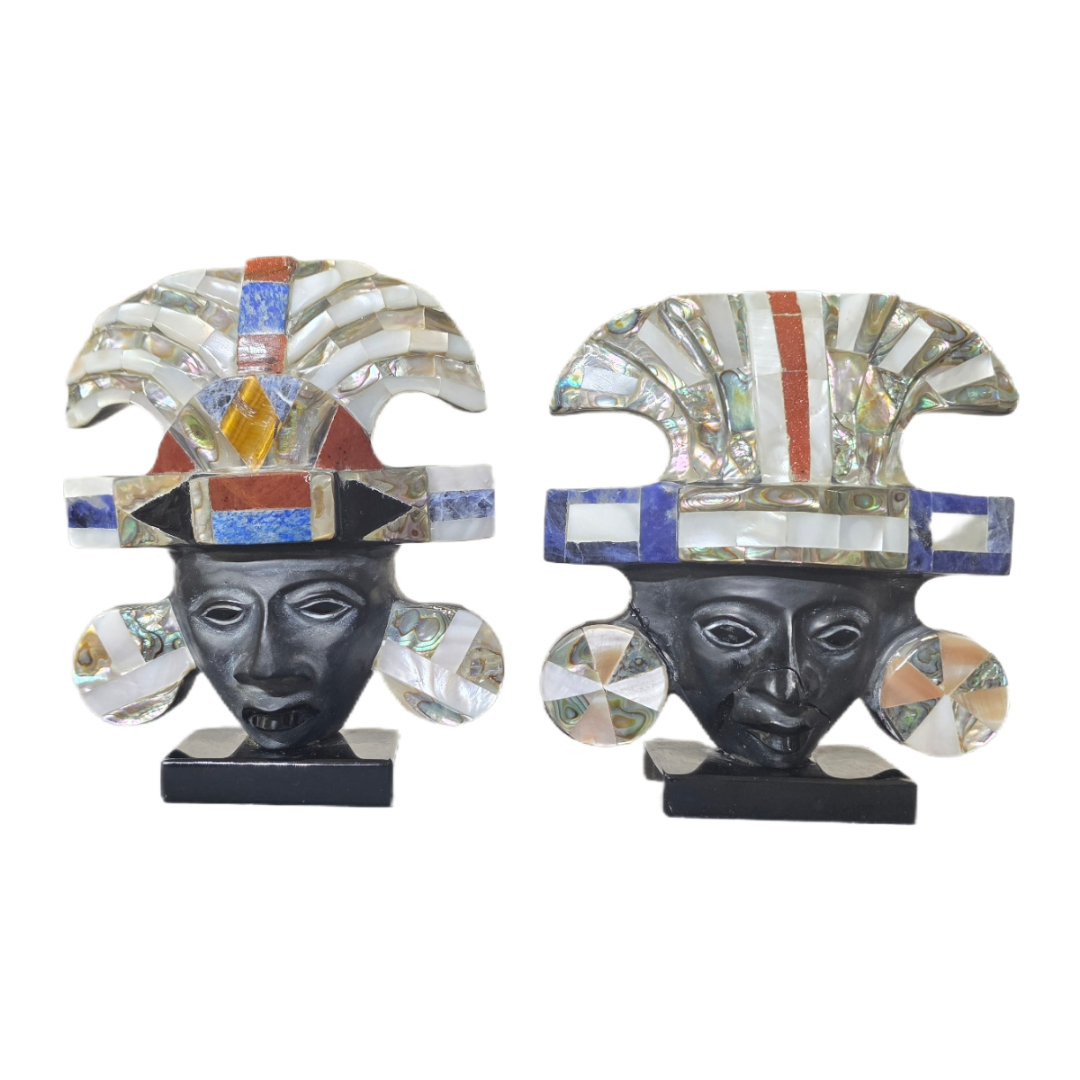 Εντυπωσιακό ζεύγος διακοσμητικών μασκών σε στυλ Αζτέκων, κατασκευασμένων από μαύρη πέτρα και διακοσμημένων με mother of pearl (όστρακο), λαζουρίτη, goldstone και άλλους ημιπολύτιμους λίθους. Οι μάσκες φέρουν πολύχρωμη «ηλιακή» κορώνα και ένθετα στοιχεία που χαρίζουν ιδιαίτερη λάμψη.