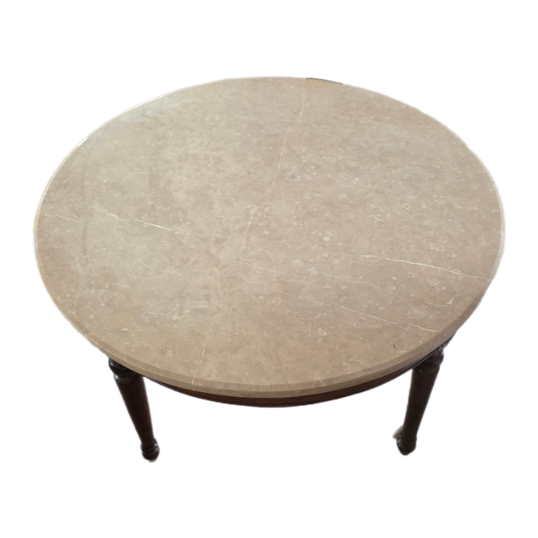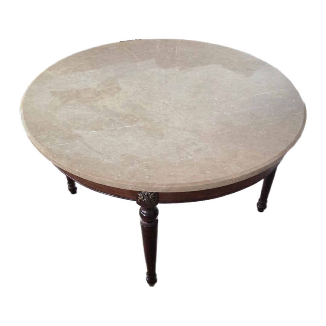 Elegant round coffee table featuring a beautiful beige marble top with natural veining, adding both luxury and stability to the piece.