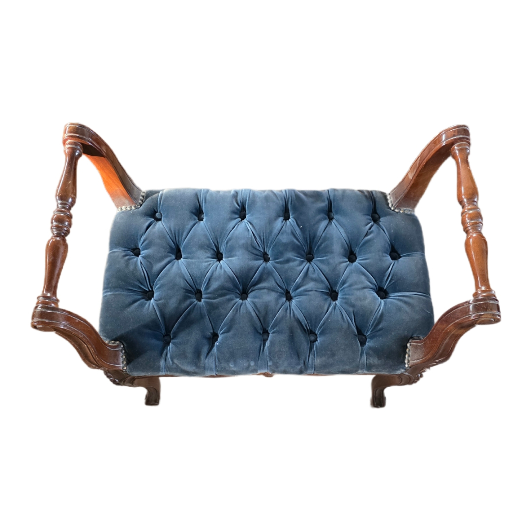 Οι δύο περίτεχνες, κυρτές χειρολαβές πλαισιώνουν το κάθισμα, το οποίο είναι επενδυμένο με καπιτονέ μπλε βελούδο και διακοσμημένο περιμετρικά με μεταλλικά καρφιά. Το ξυλόγλυπτο μοτίβο στη βάση προσδίδει επιπλέον εκλεπτυσμένο χαρακτήρα.