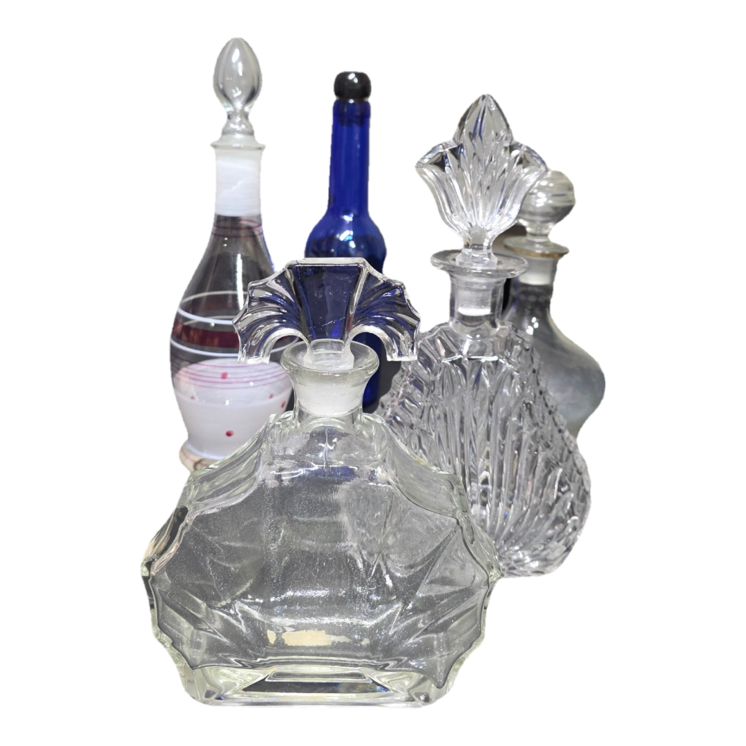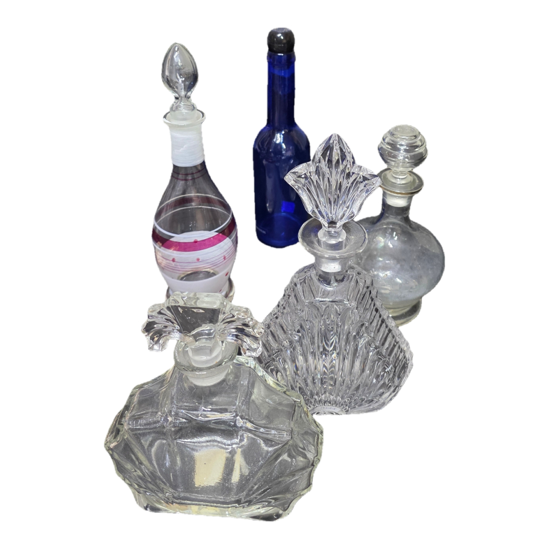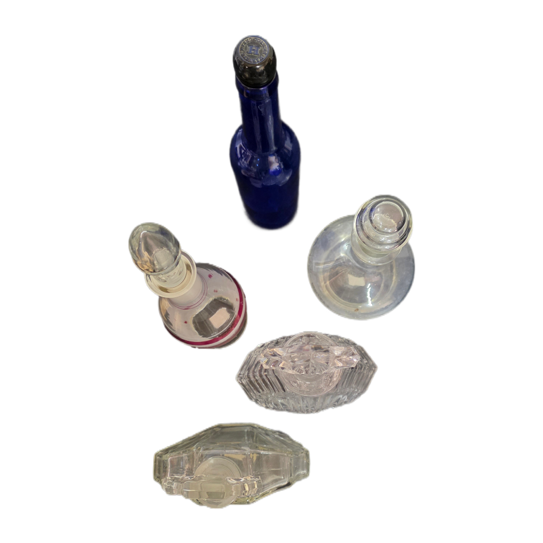 3 κρυστάλλινες φιάλες με αυθεντικά πώματα (cut crystal), πιθανόν δεκαετιών 1940–1960, 1 γυάλινη αρωματική φιάλη με ζωγραφιστή διακόσμηση, 1 κυλινδρικό μπλε μπουκάλι (φαρμακευτικού τύπου), 1 στρογγυλή γυάλινη καράφα με πώμα.