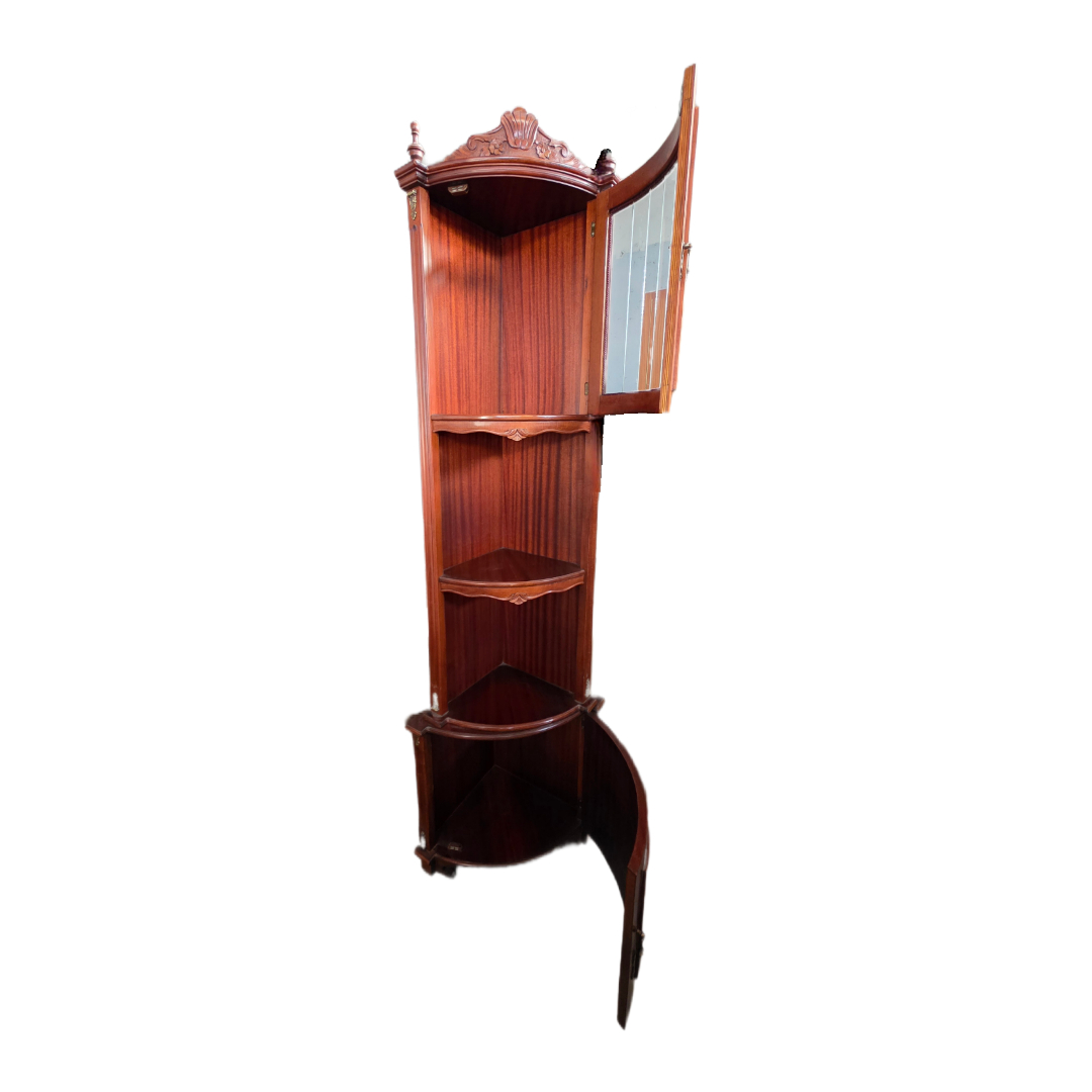 Tall antique corner display cabinet featuring an intricately carved crest and classic decorative elements.