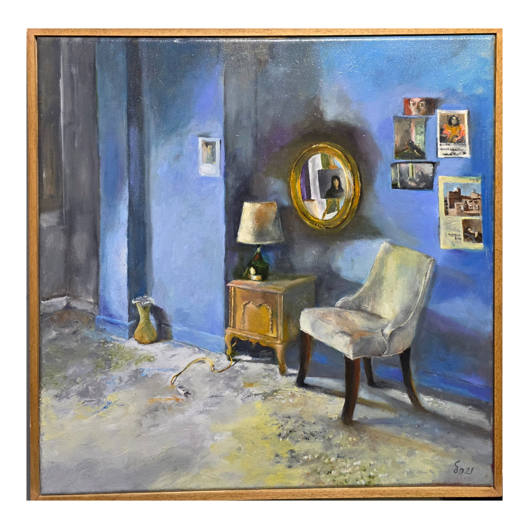 Ατμοσφαιρική σύνθεση εσωτερικού χώρου με έντονες μπλε τονικότητες, όπου η καρέκλα, ο καθρέφτης και τα επιτοίχια στοιχεία αποδίδονται με ευαίσθητη, σχεδόν ποιητική ματιά. Έργο χαρακτηριστικό της προσωπικής του εικαστικής γραφής.
