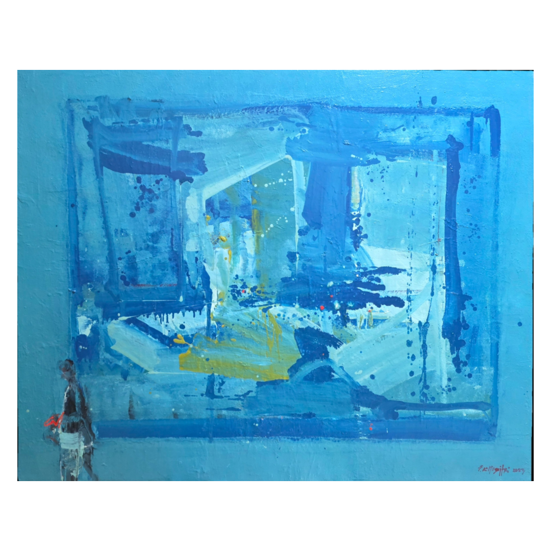 Εντυπωσιακό, δυναμικό αφηρημένο έργο μεγάλης κλίμακας, με κυρίαρχες μπλε και τιρκουάζ τονικότητες που δημιουργούν έντονη αίσθηση βάθους και κίνησης.