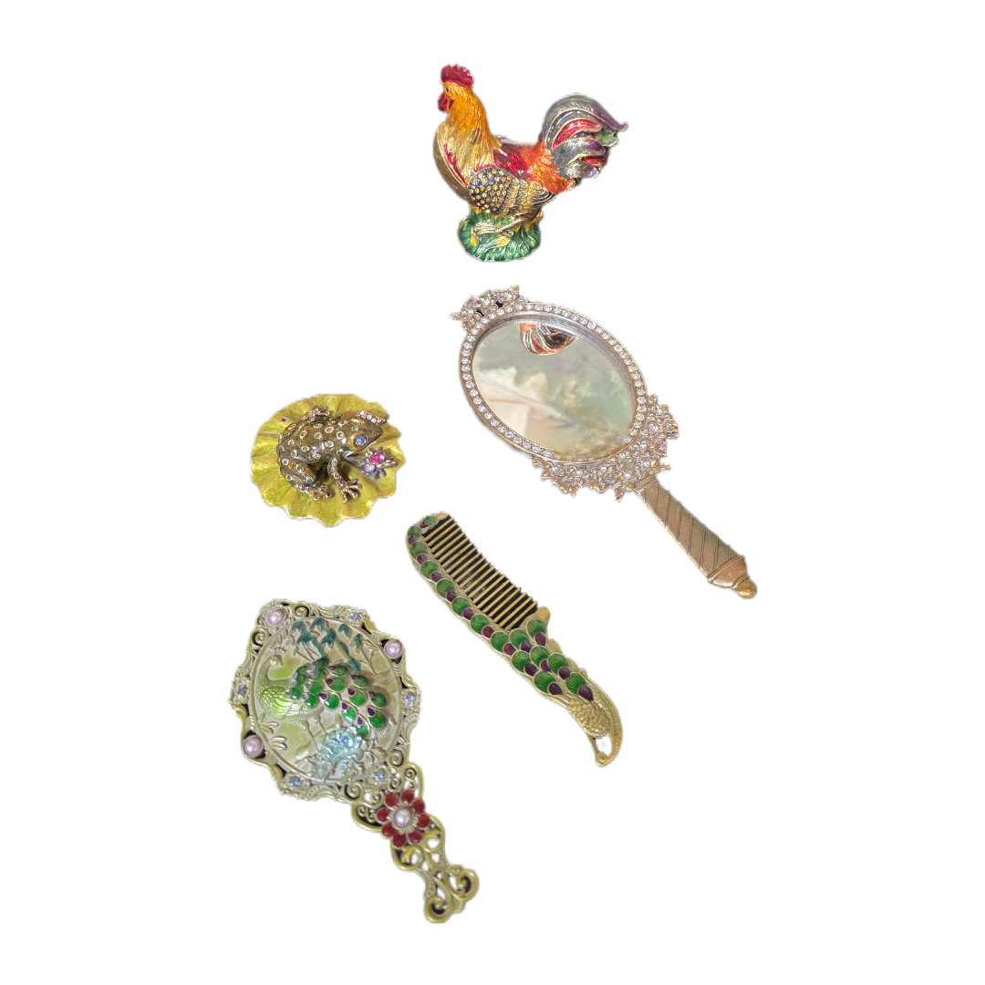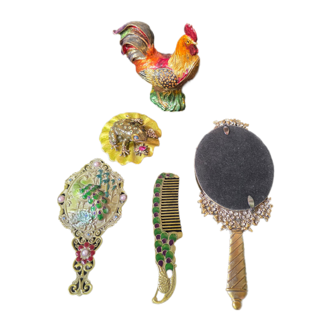 Charming set of decorative items, likely enamelled, including a small hand mirror, comb, brush, and a rooster ornament.