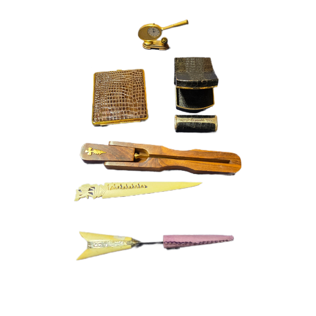 A varied selection including a small gold-tone desk clock, metal case, crocodile leather lighter case and cigarette case, wooden handcrafted tool, two carved synthetic-bone items, and a small letter opener with sheath.