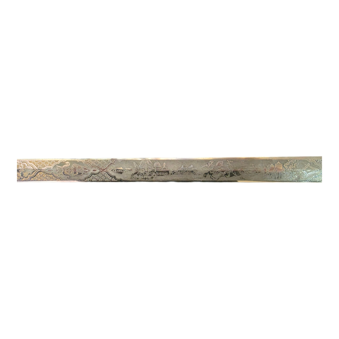 The crossguard is finely pierced and ornamented, while the metal scabbard is lavishly engraved with crosses, heraldic shields, chivalric emblems, and inscriptions. The blade itself bears engraved scenic depictions of landscapes, cities, carriages, and mounted figures, a feature found in high-quality ceremonial or honorary swords of the late 19th to early 20th century.