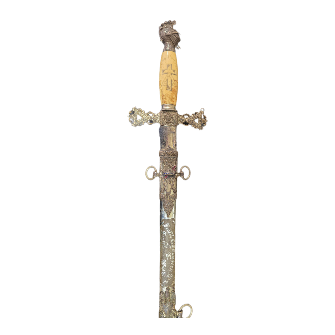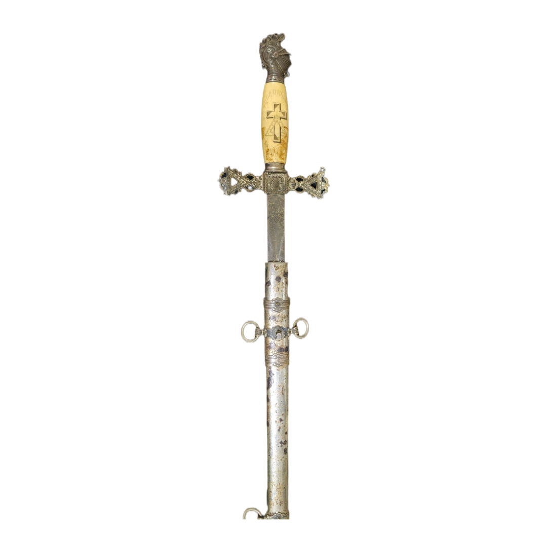 Striking masonic 19th-century sword, with highly distinctive carving, featuring strong chivalric and Christian symbolism.