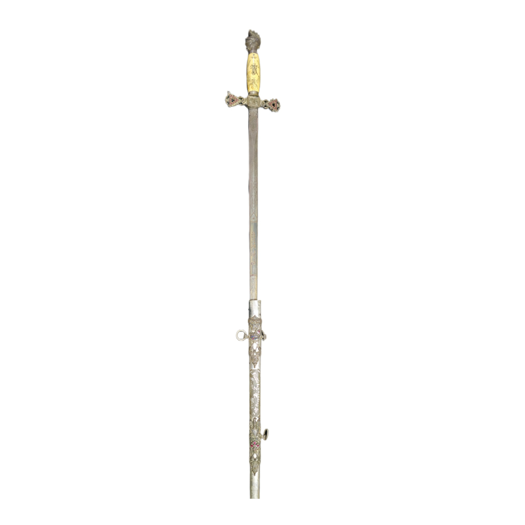 Ο σταυροειδής προφυλακτήρας παρουσιάζει περίτεχνη διάτρητη διακόσμηση, ενώ το μεταλλικό θηκάρι είναι πλούσια χαραγμένο με σταυρούς, θυρεούς, ιπποτικά εμβλήματα και επιγραφές. Στη λεπίδα διακρίνονται χαραγμένες παραστάσεις τοπίων, πόλεων, αμαξών και έφιππων μορφών, στοιχείο που συναντάται σε υψηλής ποιότητας τελετουργικά ή τιμητικά όπλα του τέλους 19ου – αρχών 20ού αιώνα.