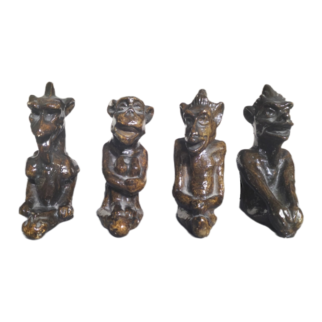 Τέσσερις μικρές διακοσμητικές φιγούρες με ανθρωπόμορφες μορφές, από γυαλί ή ρητίνη με σκούρα πατίνα και γυαλιστερή επιφάνεια.