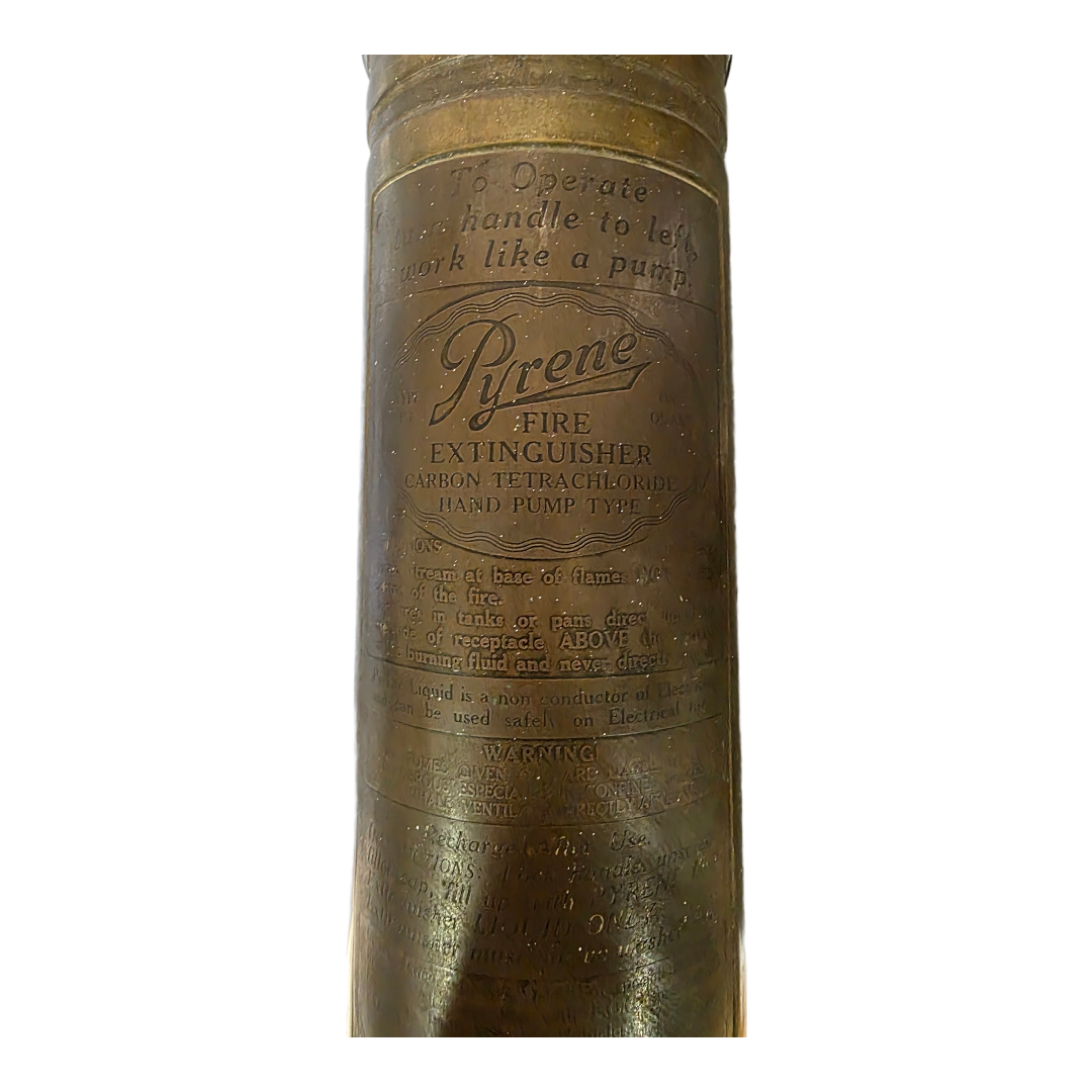 It features embossed operating instructions and the original inscription “Pyrene Fire Extinguisher – Carbon Tetrachloride”, noting its safe use even on electrical fires, according to period standards.