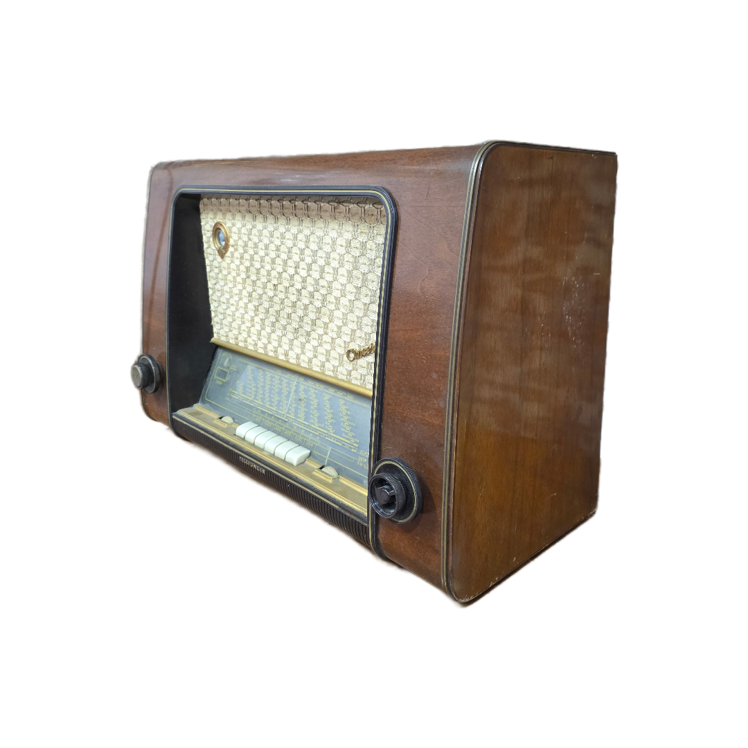 Wooden cabinet with elegant curved lines, fabric speaker grille and the characteristic multi-band glass tuning scale.