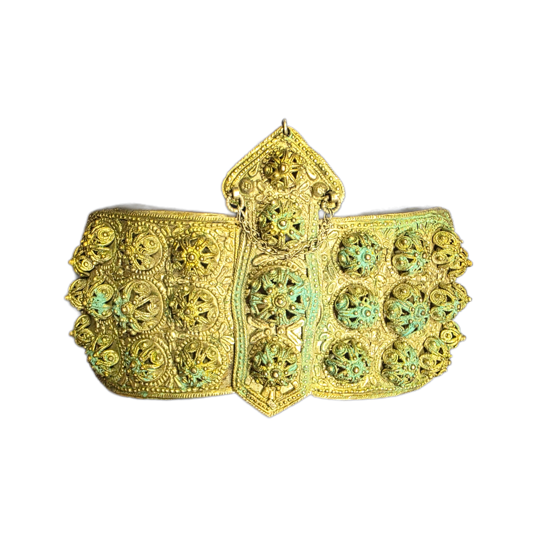 Traditional silver clasp with embossed rosettes and floral motifs.