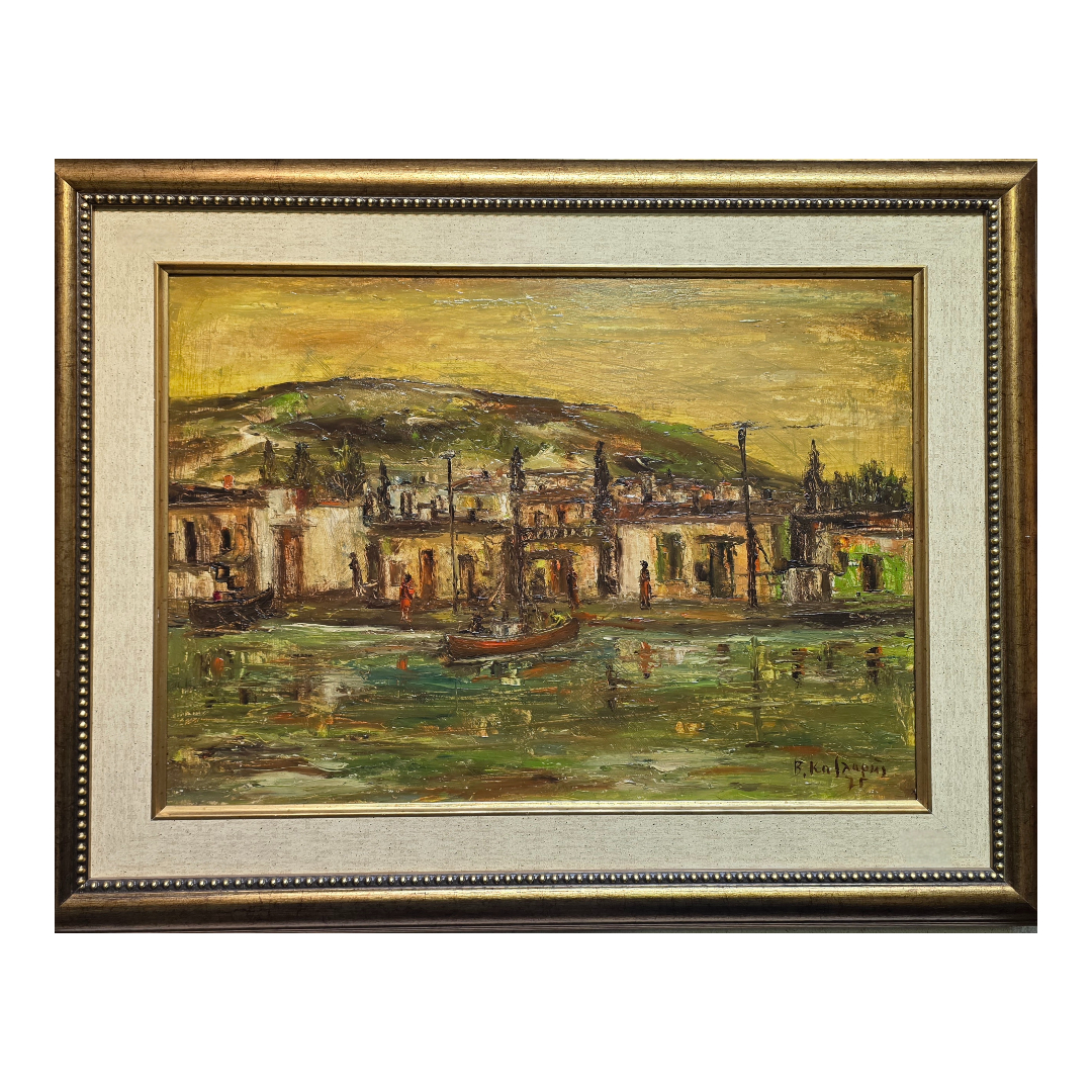 Παράκτιος οικισμός με ψαρόβαρκες και αντανακλάσεις στο νερό. Ζεστή χρωματική παλέτα και παχύρρευστη πινελιά.