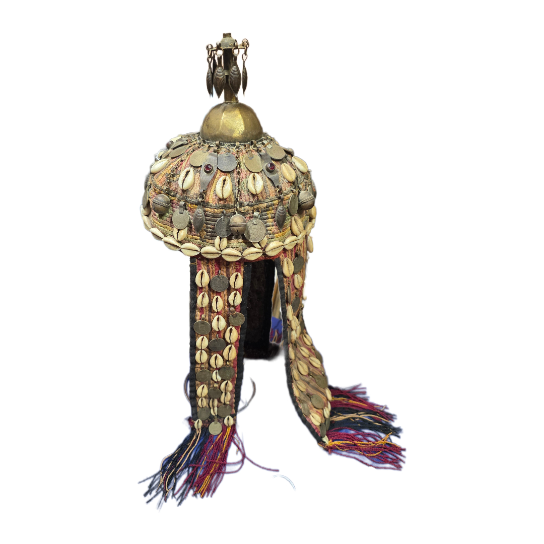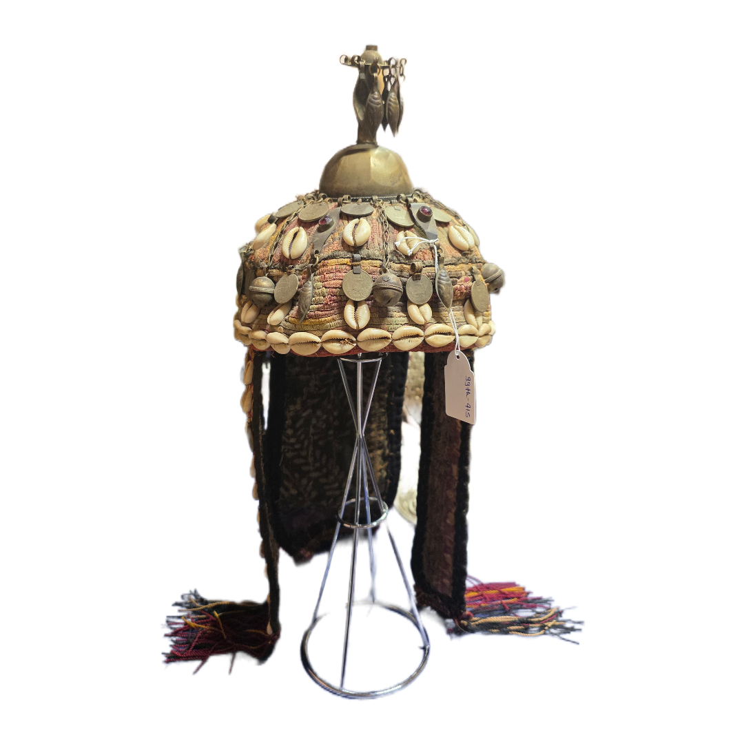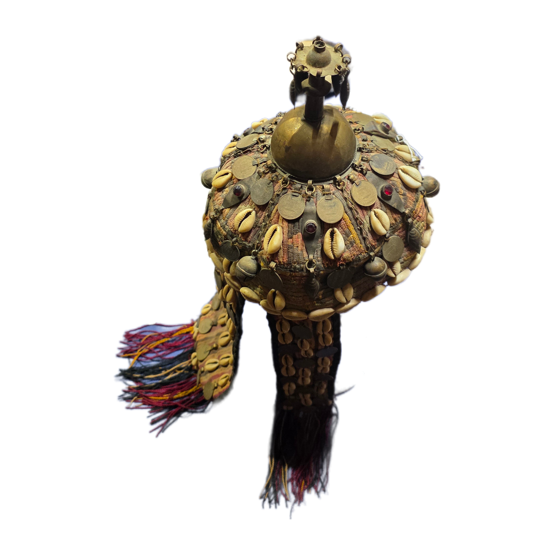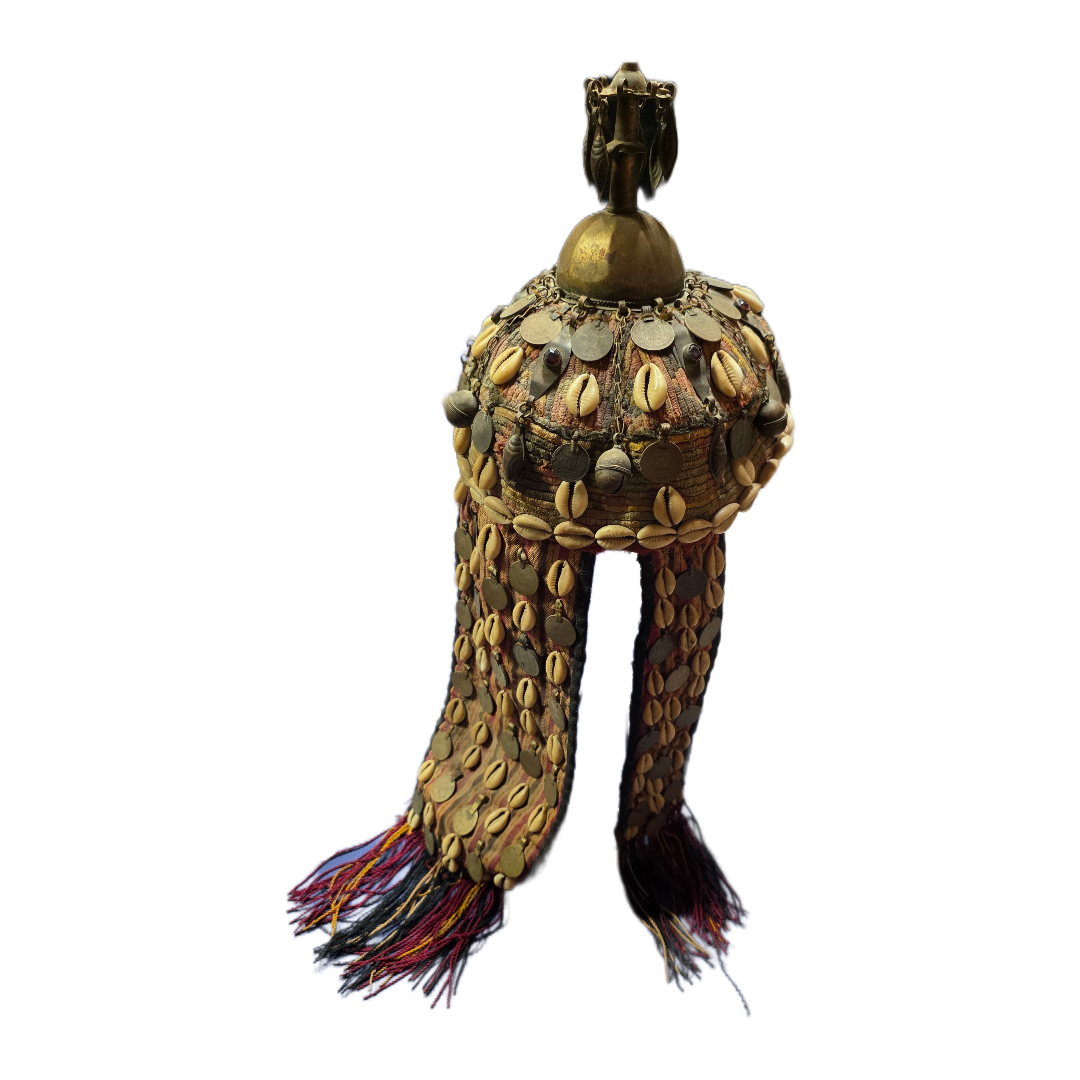 Κράνος κατασκευασμένο από μέταλλο και υφασμάτινη βάση, πλούσια διακοσμημένο με κοχύλια, μεταλλικά νομίσματα και κρεμαστά διακοσμητικά στοιχεία με πολύχρωμες φούντες.