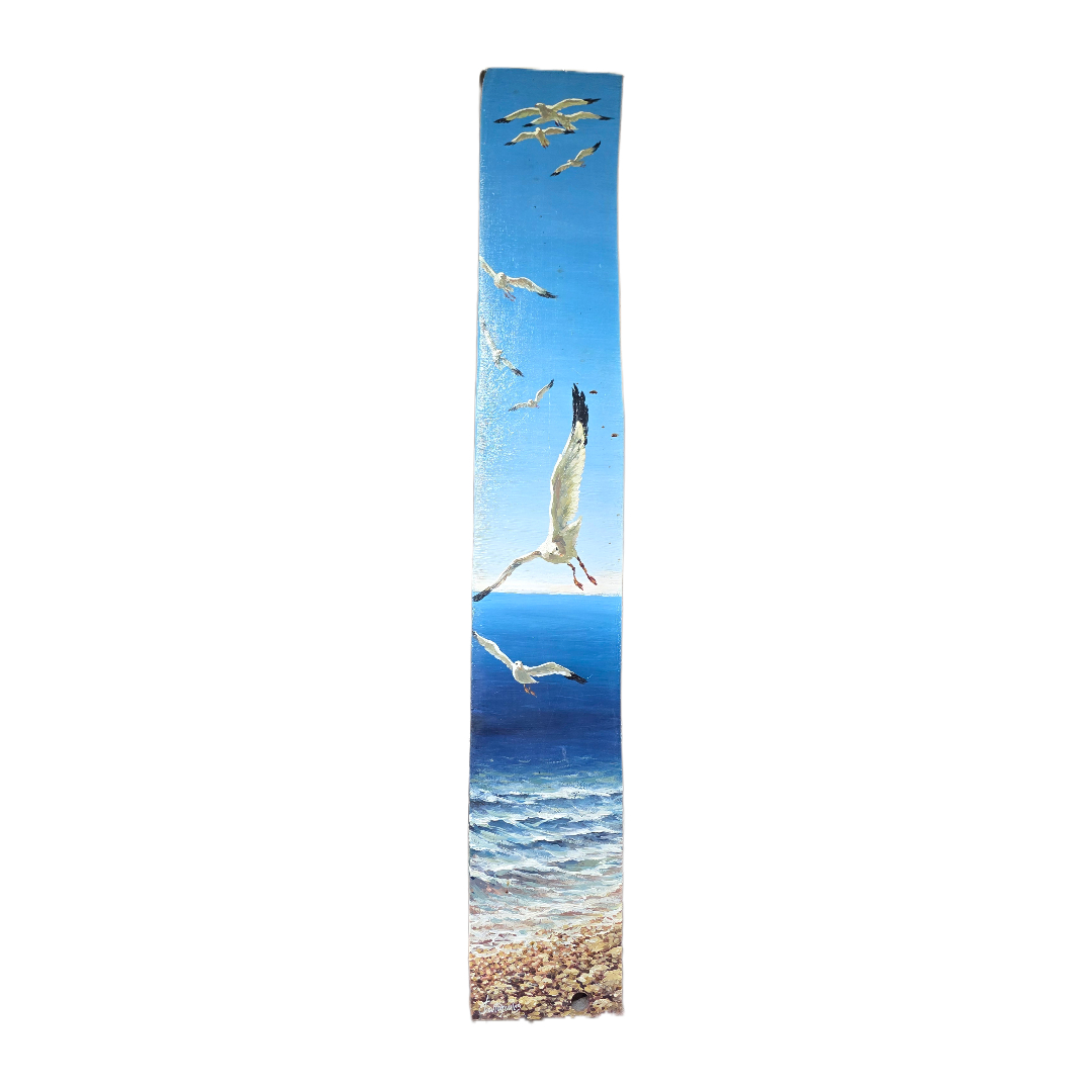 Ζωγραφική σε ξύλο του Φωτόπουλου με θαλασσινό τοπίο και γλάρους σε πτήση, αποδοσμένο με φωτεινή χρωματική κλίμακα και ρεαλιστική απόδοση της θάλασσας.