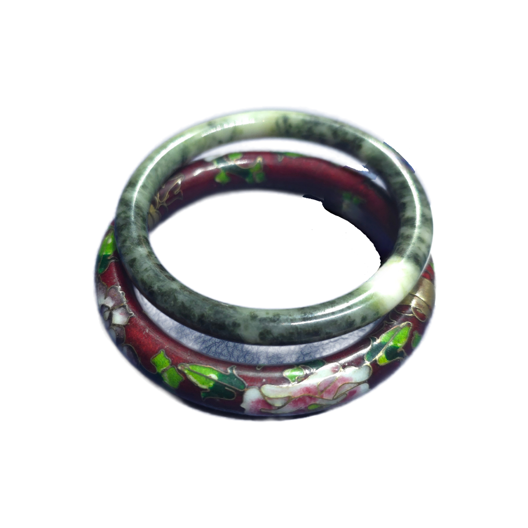 Cloisonné bracelet with floral decorative motifs in shades of red, green and white and a circular bracelet made of green marble with natural veining.