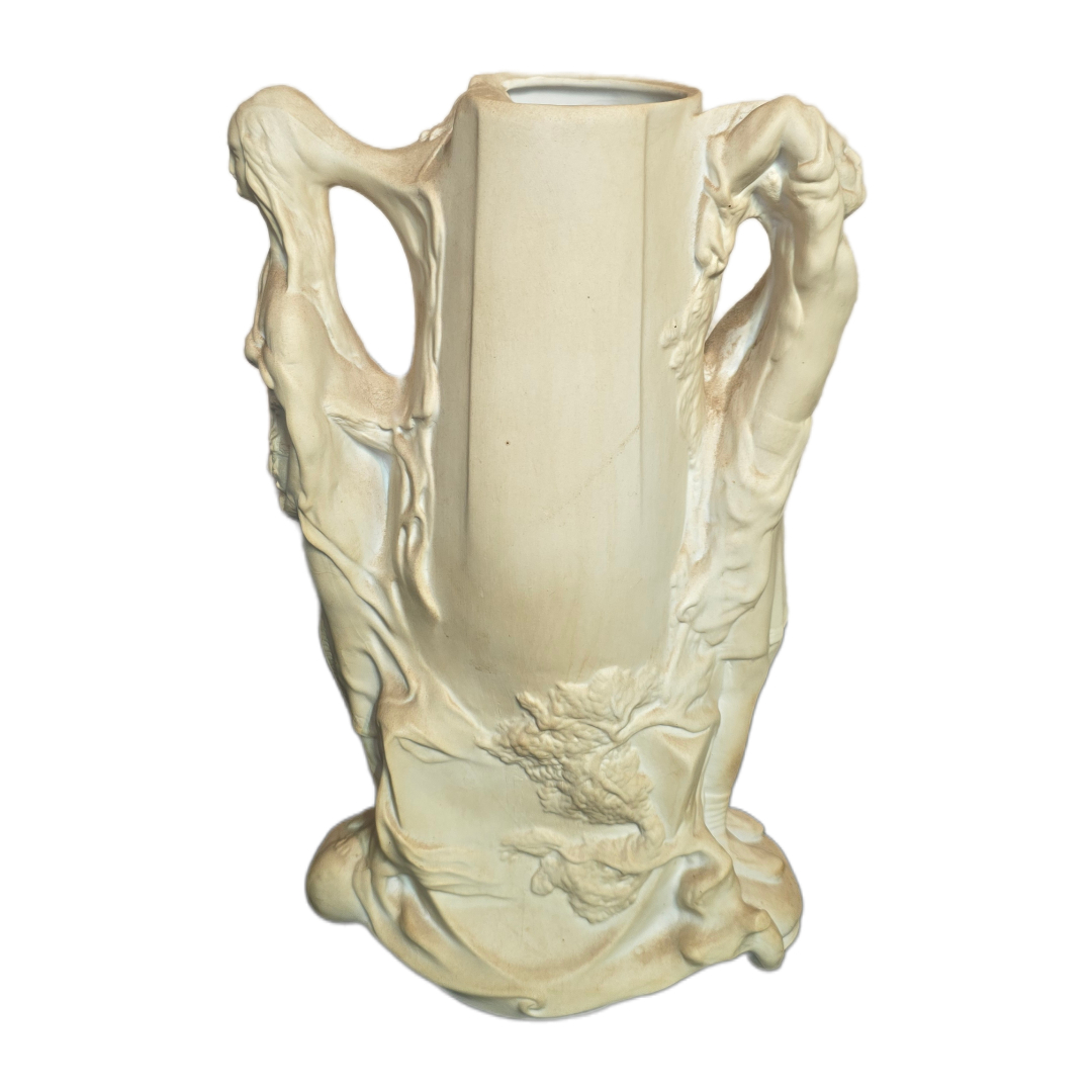 A ceramic decorative vase featuring a relief female figure and organic nature-inspired ornamentation, characteristic of the Art Nouveau style.