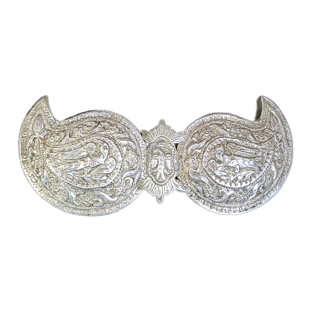 Silver paisley-shaped buckle with bird motifs.