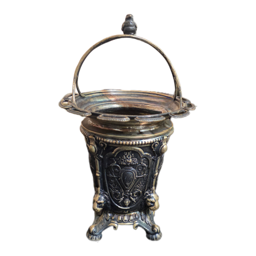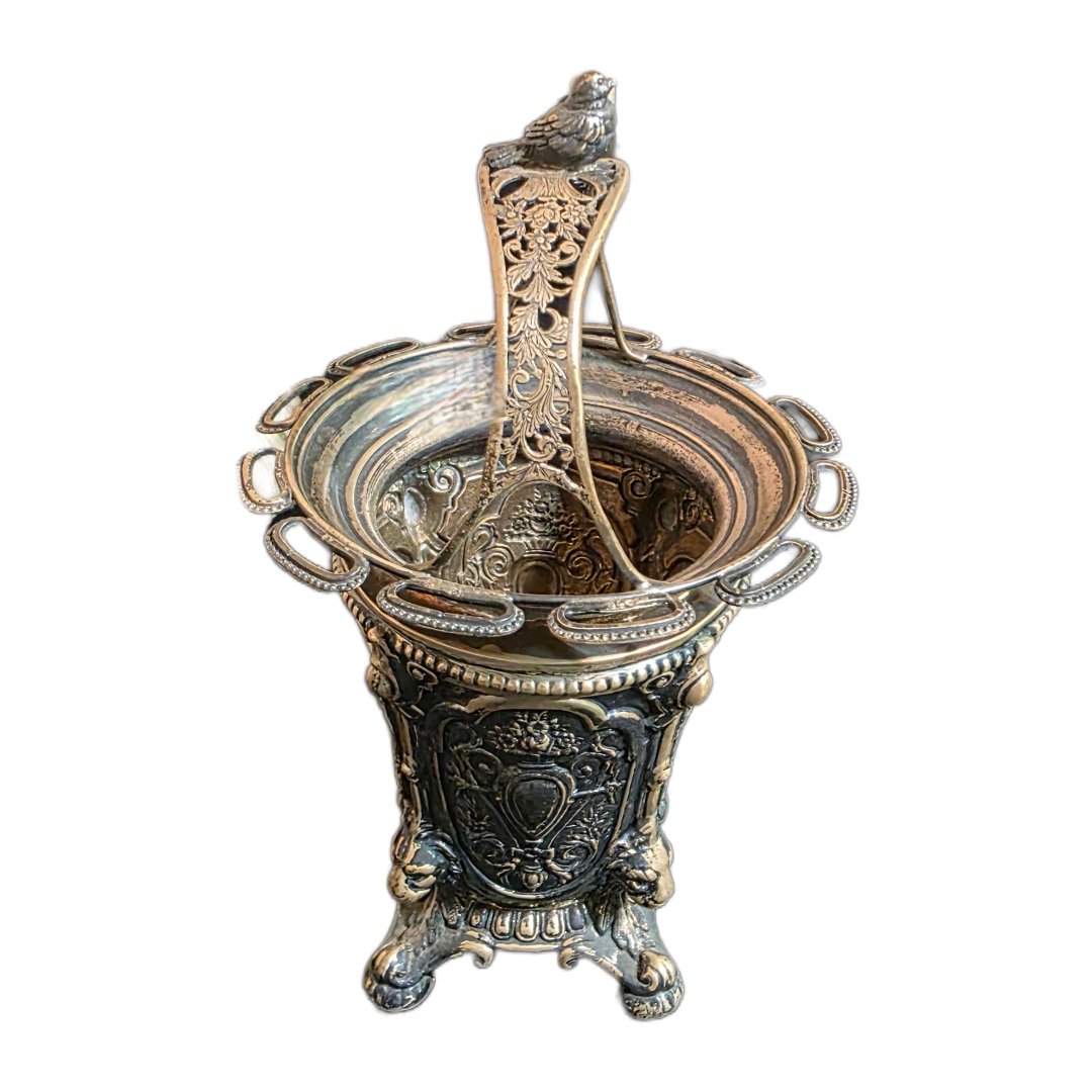 Φέρει ανασηκωμένη λαβή με διάτρητη διακόσμηση και επίστεψη σε μορφή πτηνού, ενώ στηρίζεται σε πόδια με καμπύλες γραμμές.