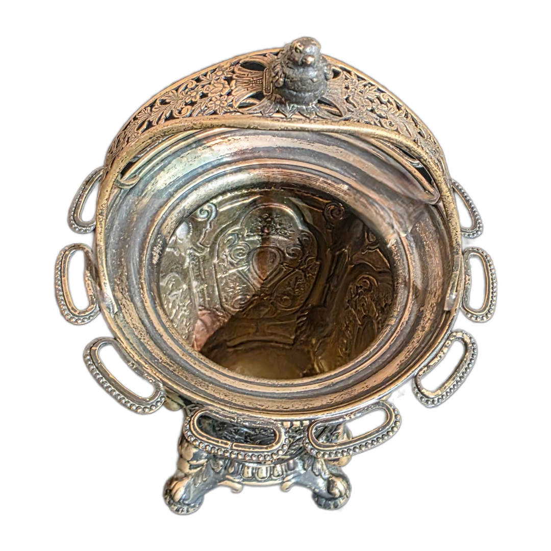 A decorative sugar bowl richly adorned with relief floral motifs and cartouche panels. It features a raised pierced handle surmounted by a bird finial and stands on curved feet. Probably a European silver-plated piece, 20th century.