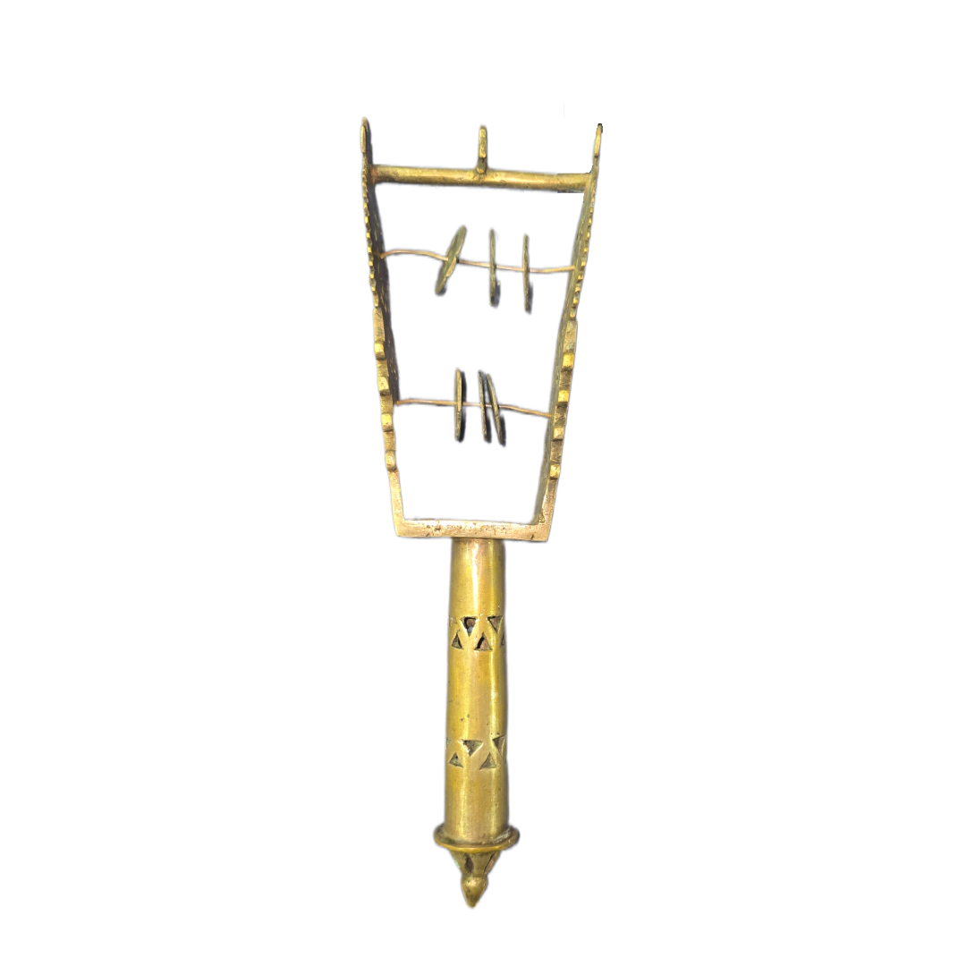 Metal object, likely of ceremonial or folkloric use, featuring pierced geometric decoration and small movable metal discs that produce sound when shaken. Possibly an ethnographic or ritual item.