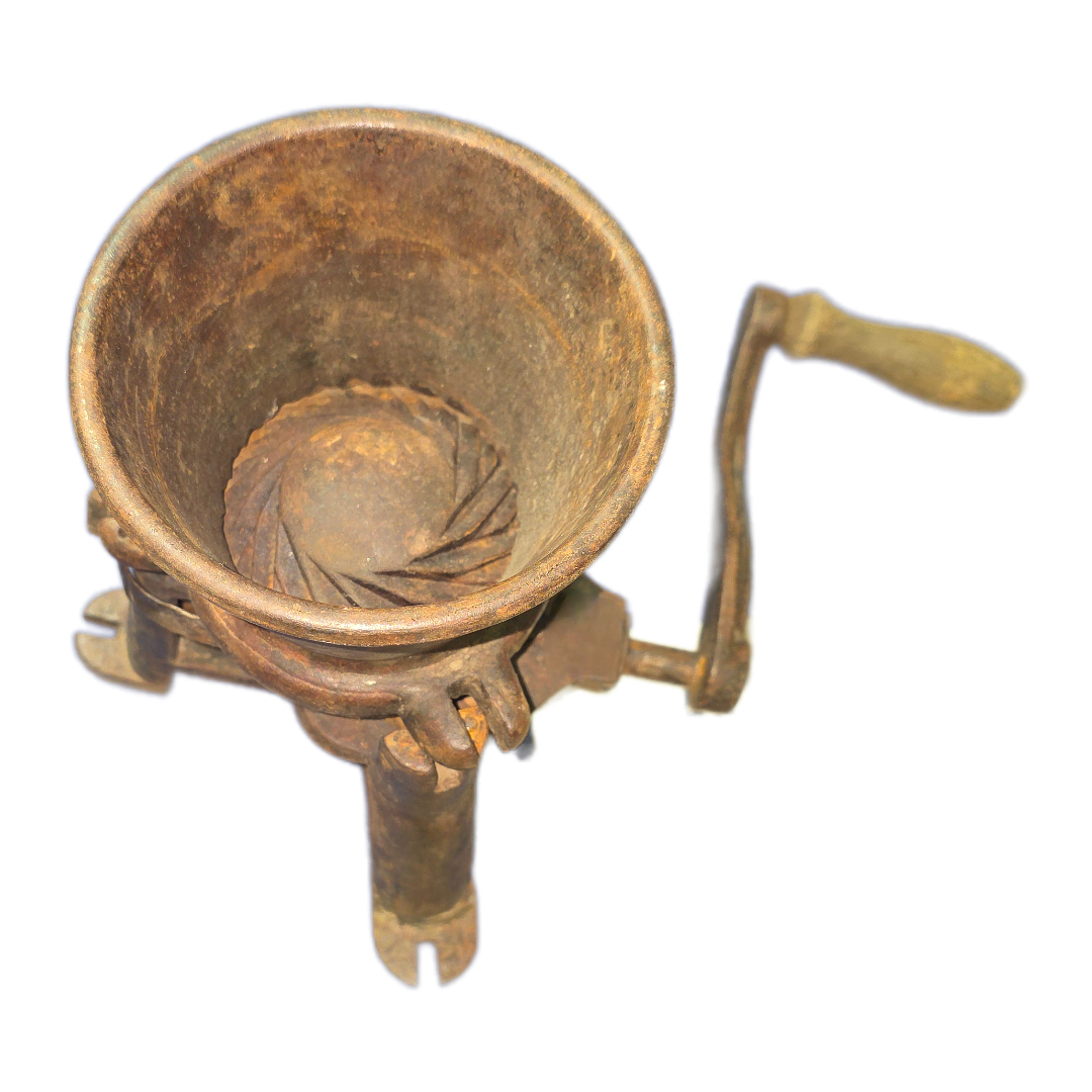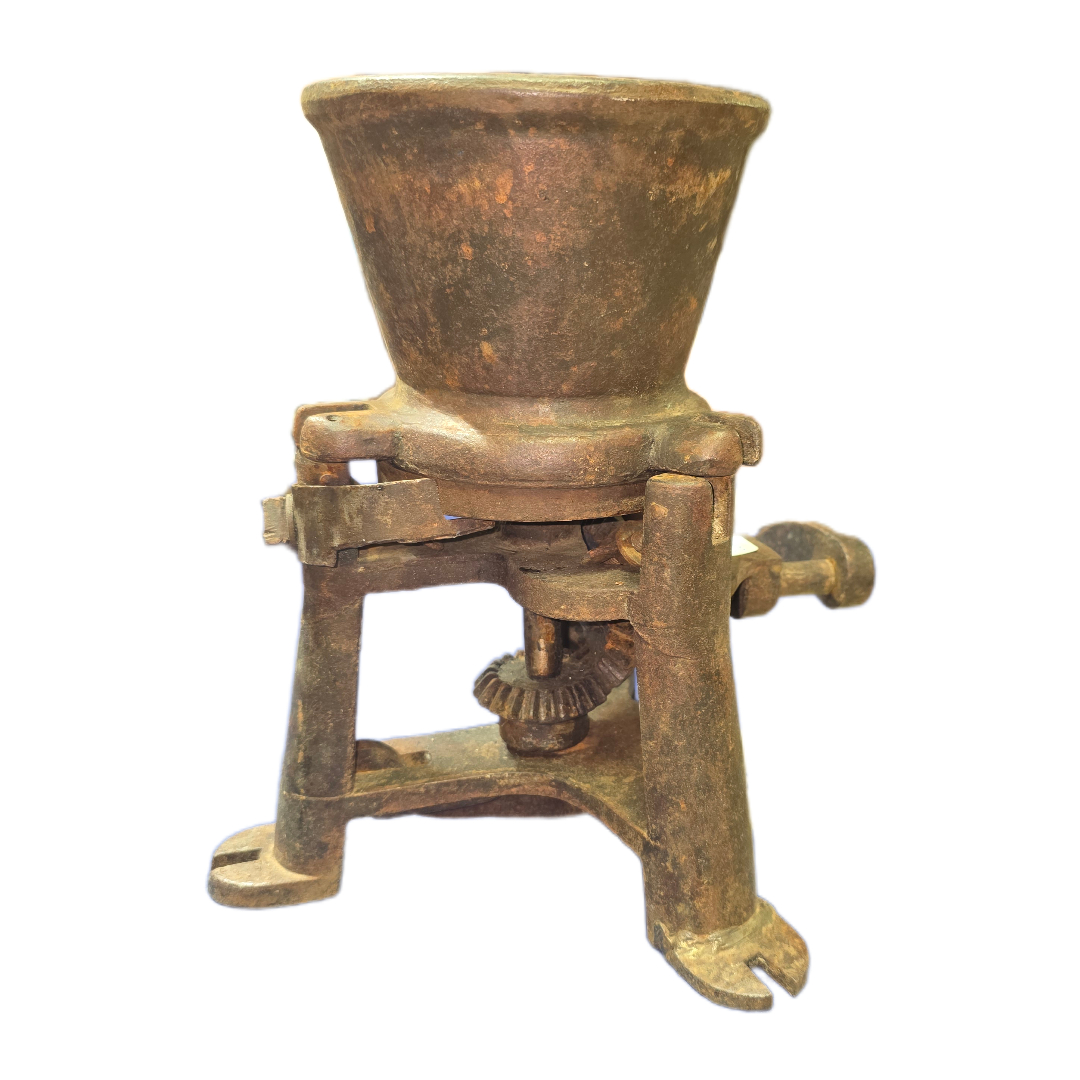 Χυτοσιδηρός μύλος με κωνική χοάνη, εσωτερικό οδοντωτό μηχανισμό και πλαϊνή μανιβέλα με ξύλινη λαβή. Πιθανότατα 20ού αιώνα.